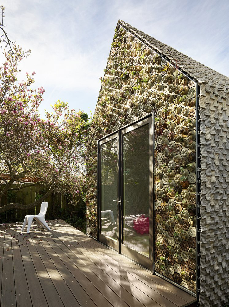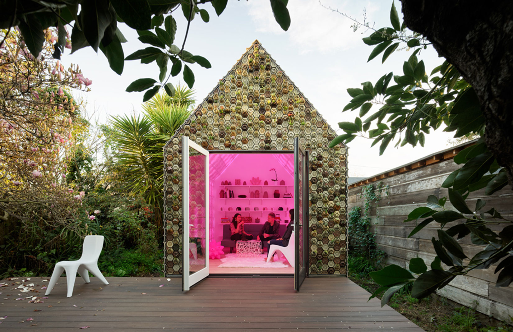 ‘Seed stitch’ tiles – named for their knitted and overlapping appearance – act as a rain screen for the modular structure’s gabled roof and side walls, while planter tiles are sewn with succulents and vegetation native to northern California, creating a living skin.
