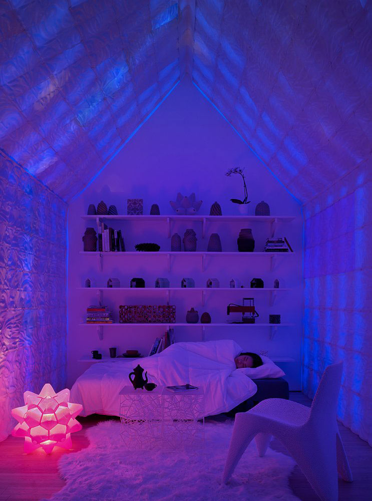 Interiors have been wrapped in a translucent chroma curl wall made from a corn-based bioplastic. This internal membrane is embedded with LEDs that can cast the interiors aglow.