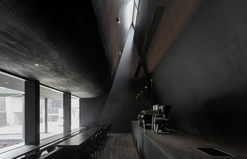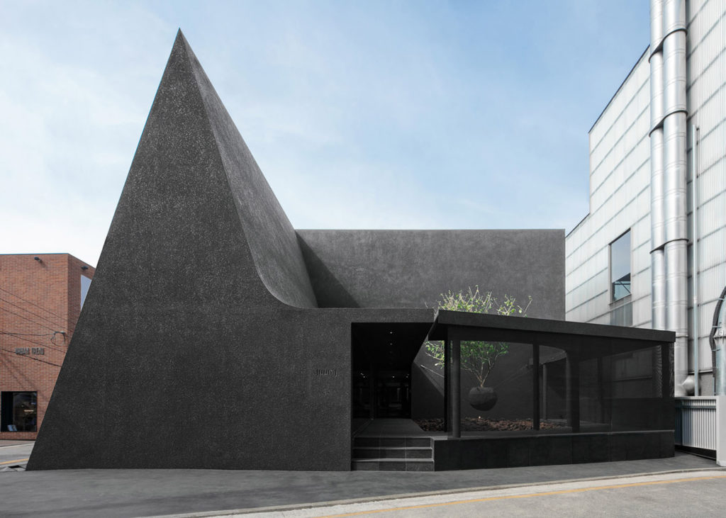 Triangular cafe ‘Felt Coffee’ can be found inside Juun J’s flagship store in Seoul. The geometric, all-black structure – designed by Korean practice WGNB – has a circular courtyard and skylights which channel angular streams of natural light inside the coffee shop. The monochromatic cafe is a minimalist’s dream.