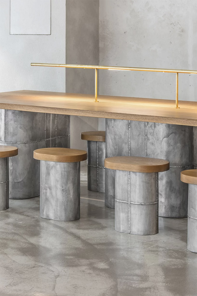 It’s all about the clean lines and concrete at ‘Yyyyynnn’ which opened earlier this year in Seoul’s Samcheong-dong neighbourhood. Designed by local practice Studio Unravel, Yyyyynnn’s stripped-back interiors open onto the street through bi-folding glass doors. A monumental communal bench acts as the centrepiece.