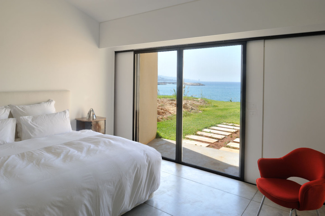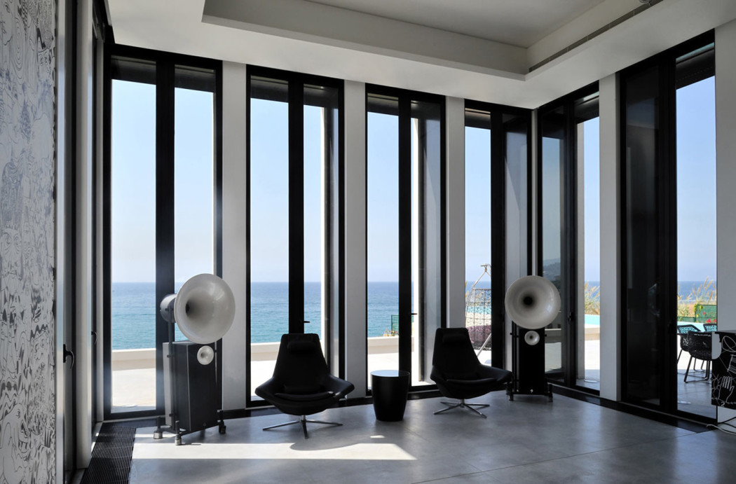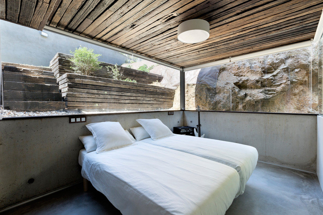 Built from concrete and stone, the house blends into its rocky surrounds. Floor-to-ceiling windows frame views of the Mediterranean, further blurring the boundaries between the built and the natural.