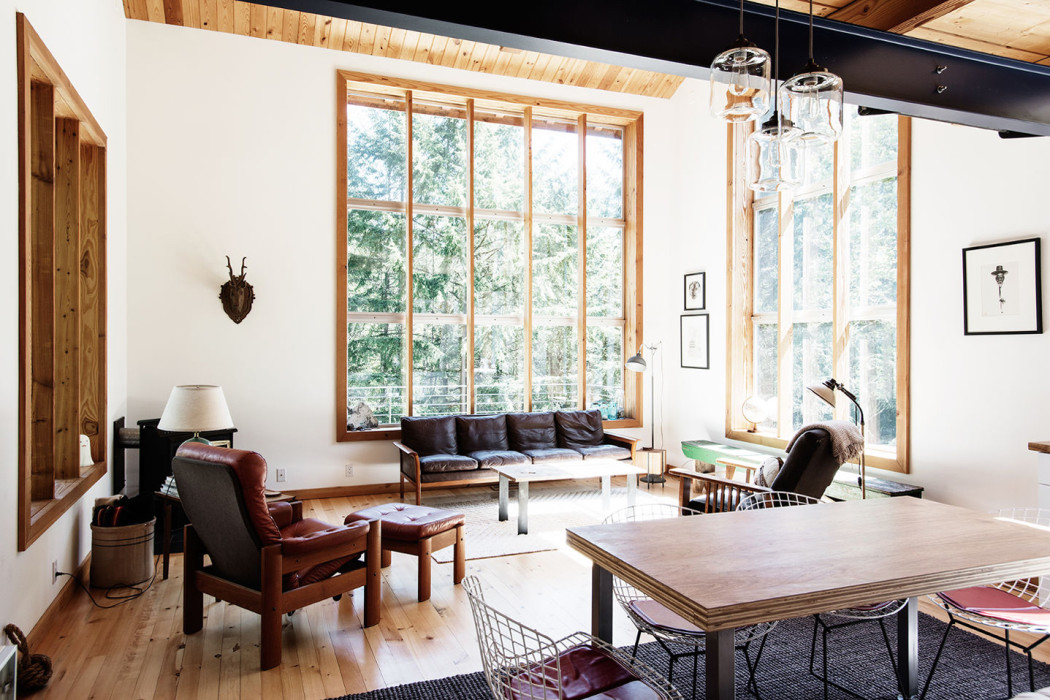 Huge vaulted ceilings feature throughout the 3-bedroom property, as well as floor-to-ceiling windows that bring the outdoor woodland setting inside. White walls and varnished wooden floors add to the ‘soft minimalist’ interior aesthetic, which is furnished with midcentury leather sofas.