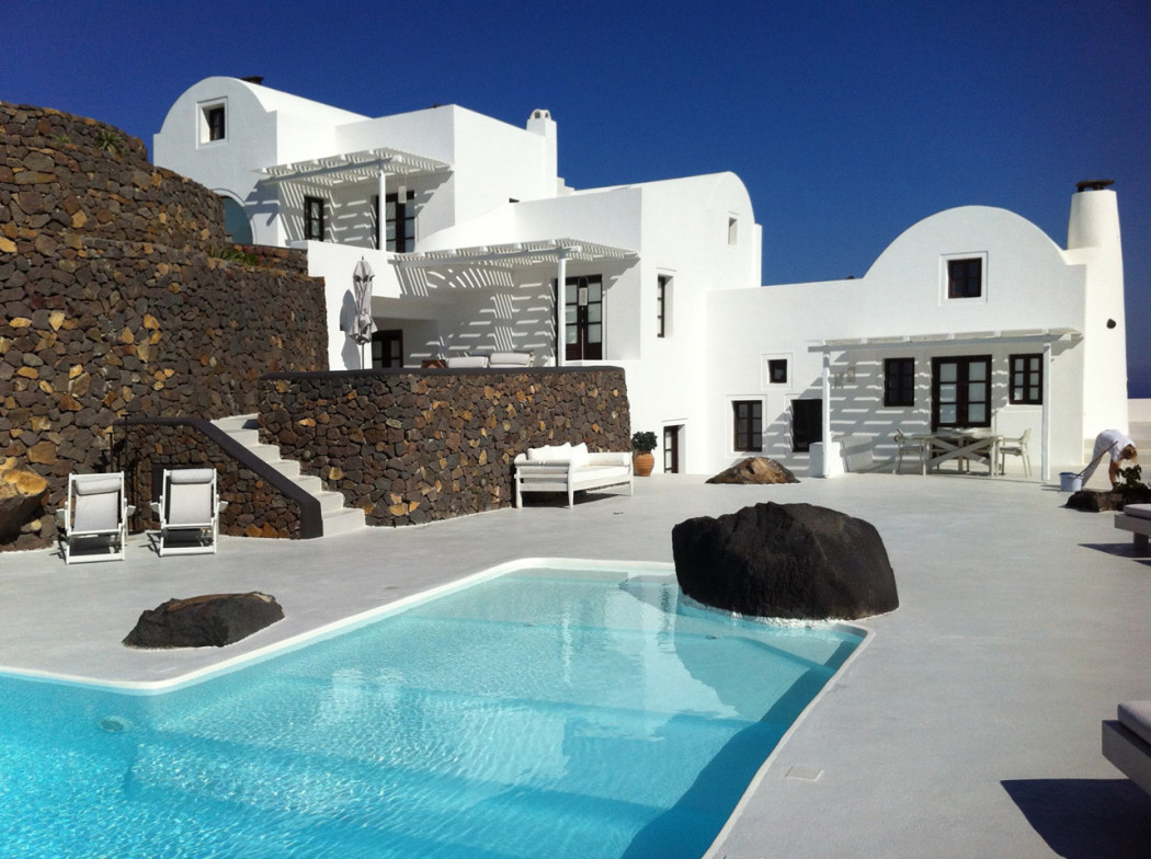 Blending traditional Cycladic architecture and contemporary Greek design, the villas feature curved white walls and smooth surfaces, juxtaposed against the rocky, volcanic surrounds. Inside, a brilliant white colour scheme is softened local quarried stone and wood.