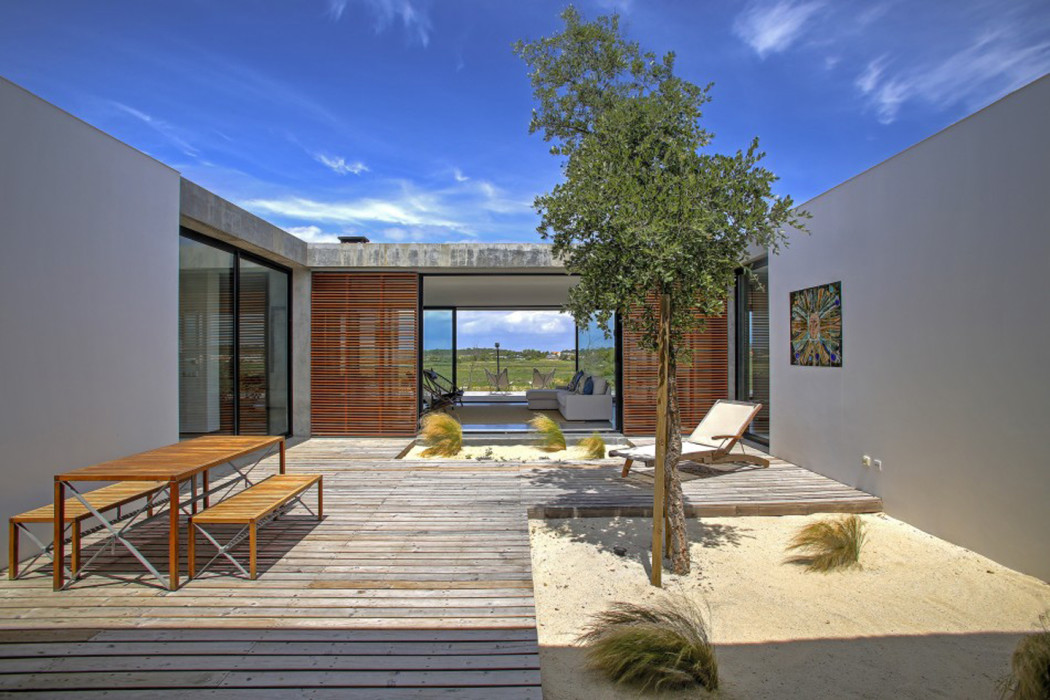 Designed by architect Pedro Ferreira Pinto, this single-storey villa is a stone’s throw from Pego Beach on the Alentejo Coast, voted Portugal’s best for its clean waters and sand. Built in a protected nature reserve, the house is raised on stilts, ensuring it touches lightly on its surrounds. Its landscaped gardens blend with the surrounding dunes.