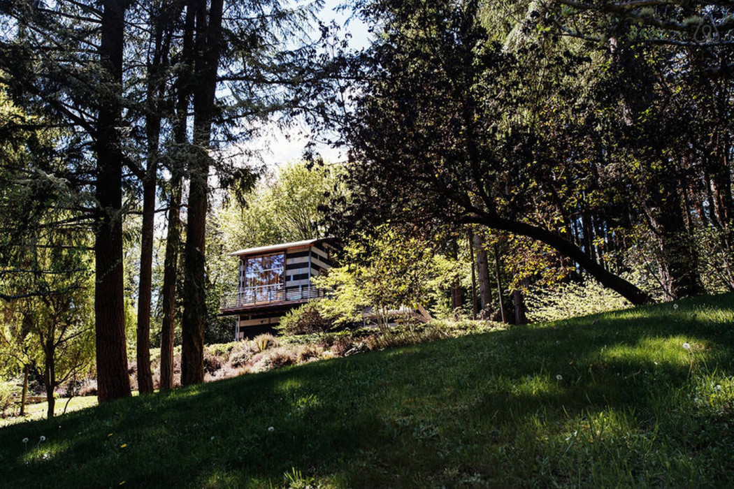 This house on Fox Island, Washington, nestles into a sloping, 1.5 acre plot of woodland just a short walk from the beach.
