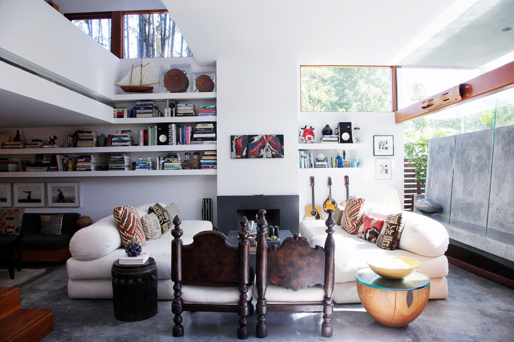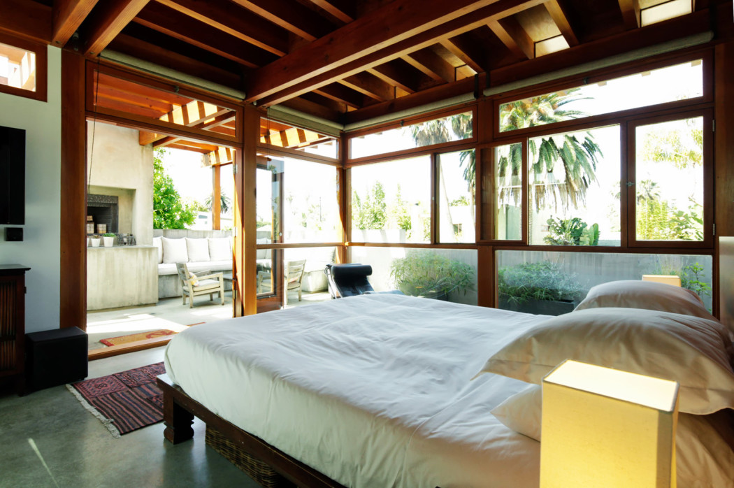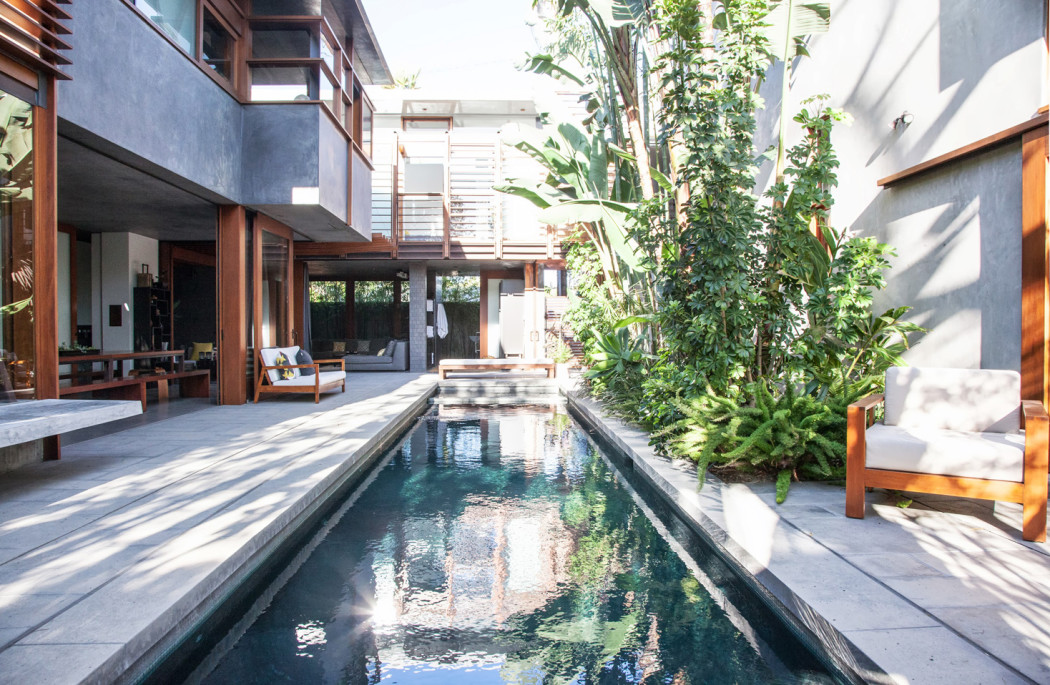 This LA house’s four main spaces are ‘pods’ connected via walkways, which create fluid movement between indoors and outdoors. Custom moulded concrete floors and reclaimed wooden walls form the main structures – and colours – of the interior space.