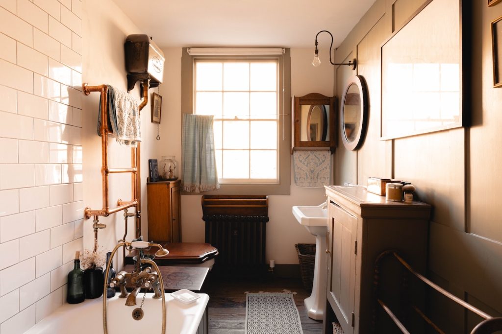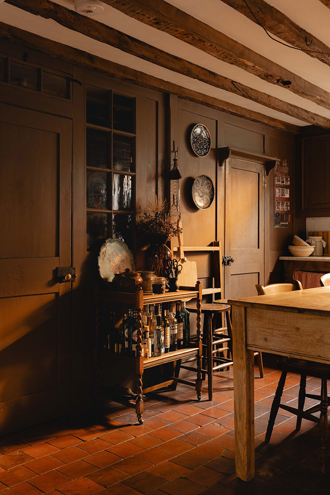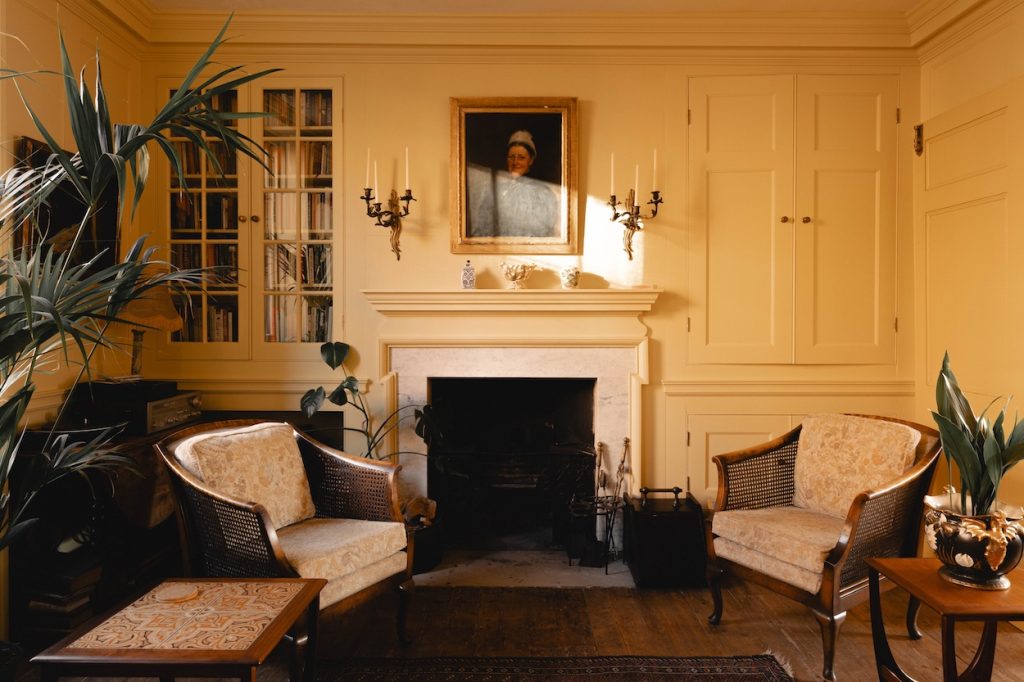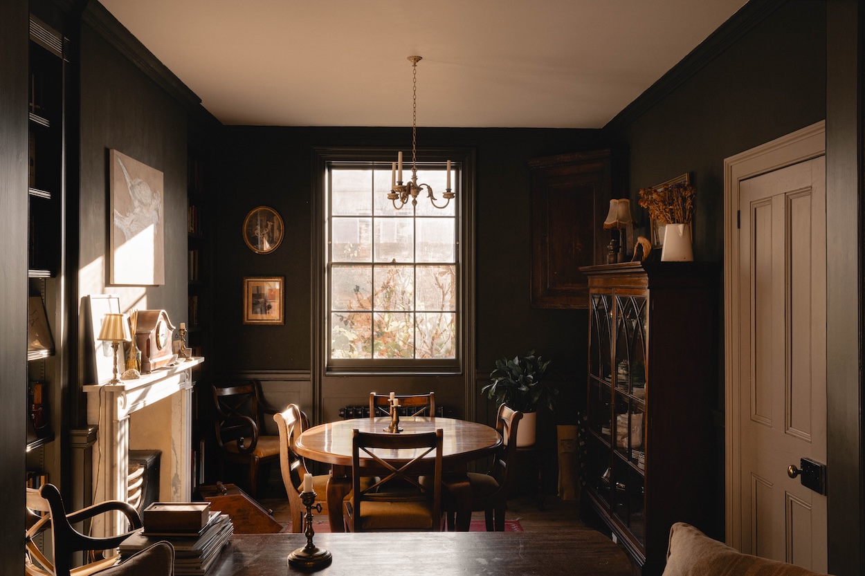 The plan unfolds with quintessential East London Georgian character. A double-return staircase rises from a restrained entrance hall, leading to a raised ground-floor reception that runs front to back, its sash windows framing both street and garden. Original shutters, wide floorboards, fireplaces and early 19th-century cornicing remain intact, while lighting is deliberately limited to lamps and candlelight. Below, kitchen and breakfast rooms are rooted firmly in the age of the house, with reclaimed quarry tiles, salvaged timbers and a traditional larder set against an external wall. Upper floors hold a generous principal suite and two further bedrooms, alongside a bathroom fitted with early-20th-century fixtures.