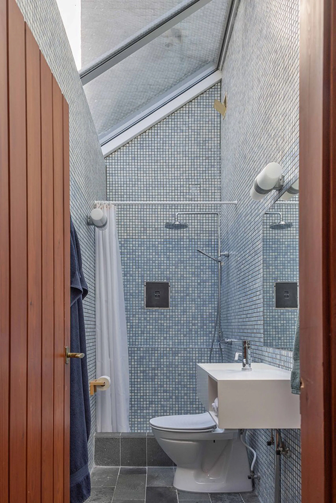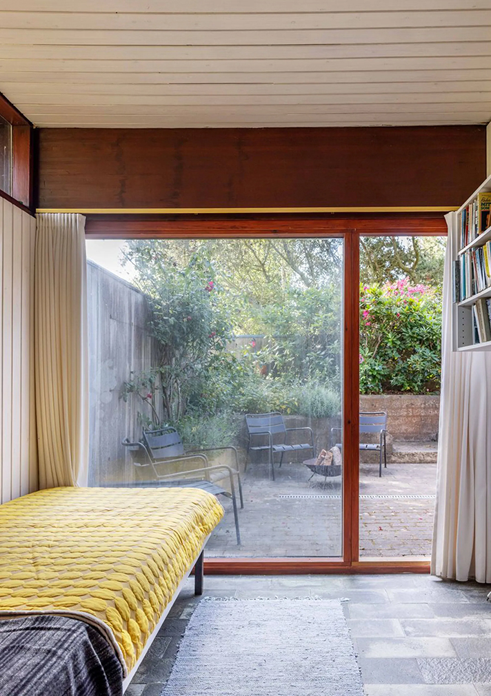 The home’s plan remains true to the late-60s thinking that shaped it. Two linked living rooms form the upper level, connected to a functional kitchen that anticipated today’s open layouts. A well-proportioned bedroom completes this floor. Below, four additional rooms are arranged as bedrooms, supported by bathrooms and direct access to a sheltered, courtyard-like garden.