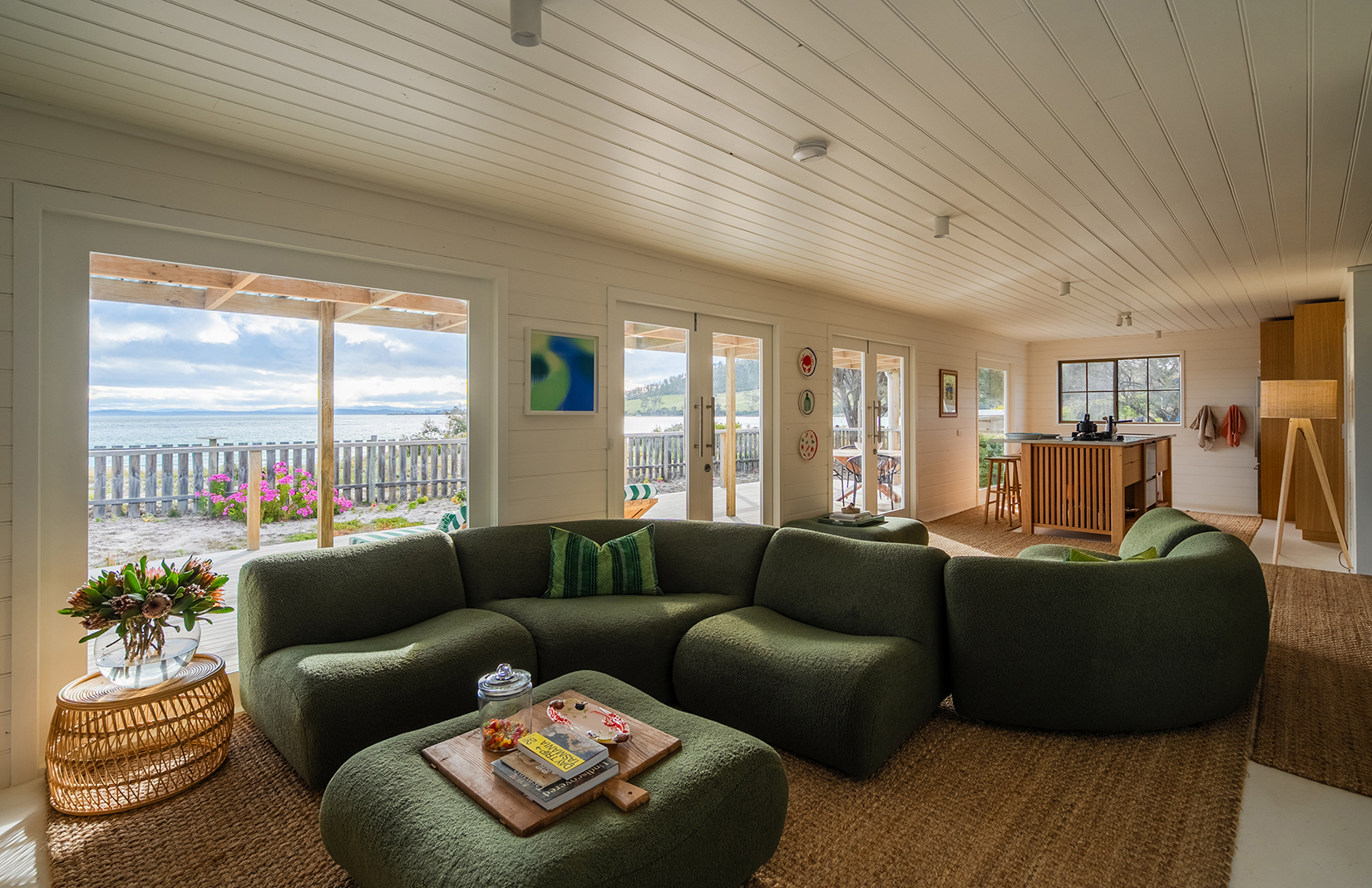 Set across 2,869sqm, the property opens into a coastal garden that acts as a natural threshold to the shoreline. The sound of birds, shifting light and the pull of the water frame daily life here, an easy 45 minutes from Hobart.