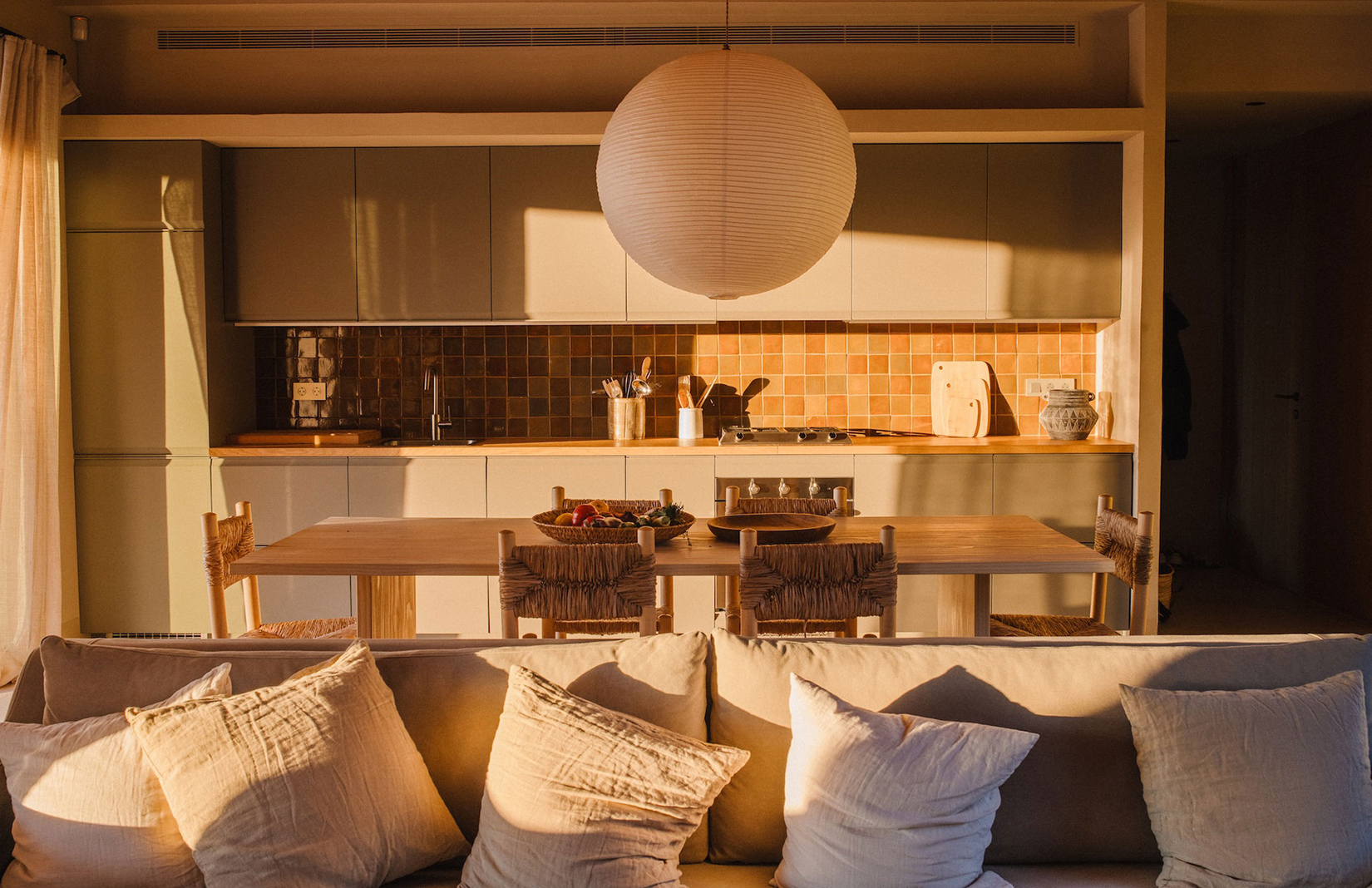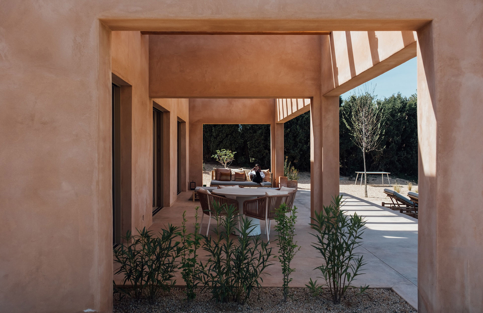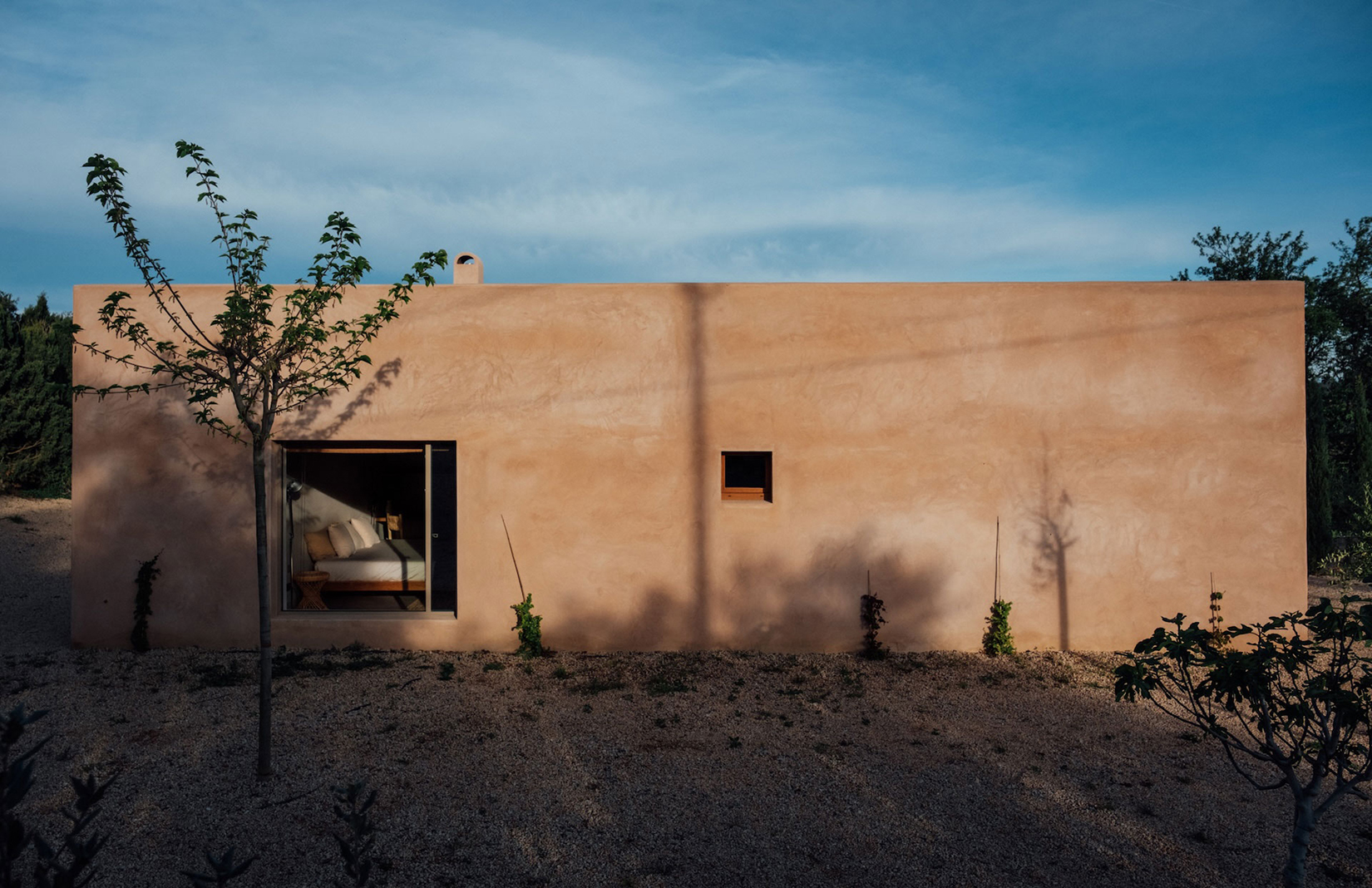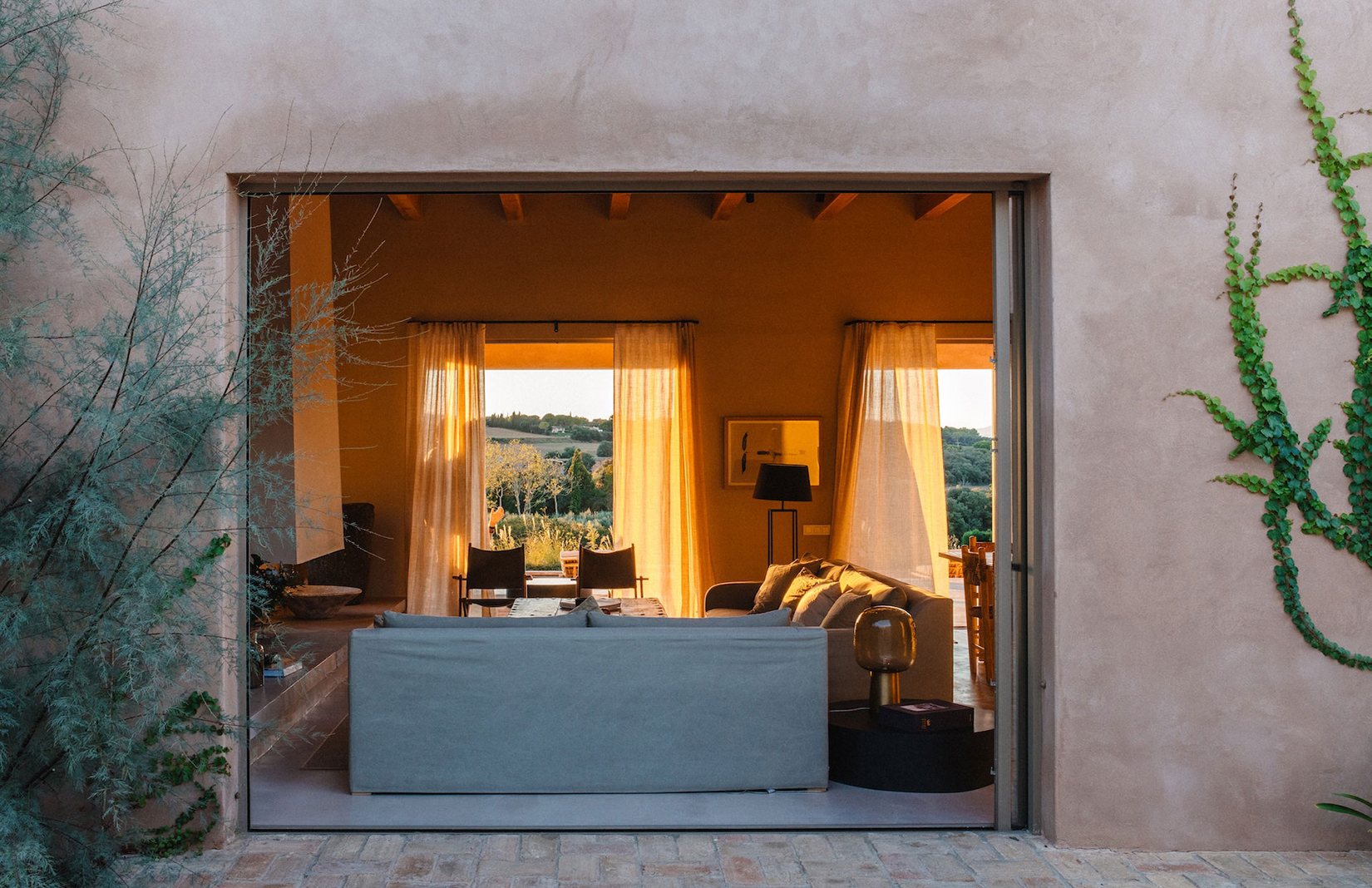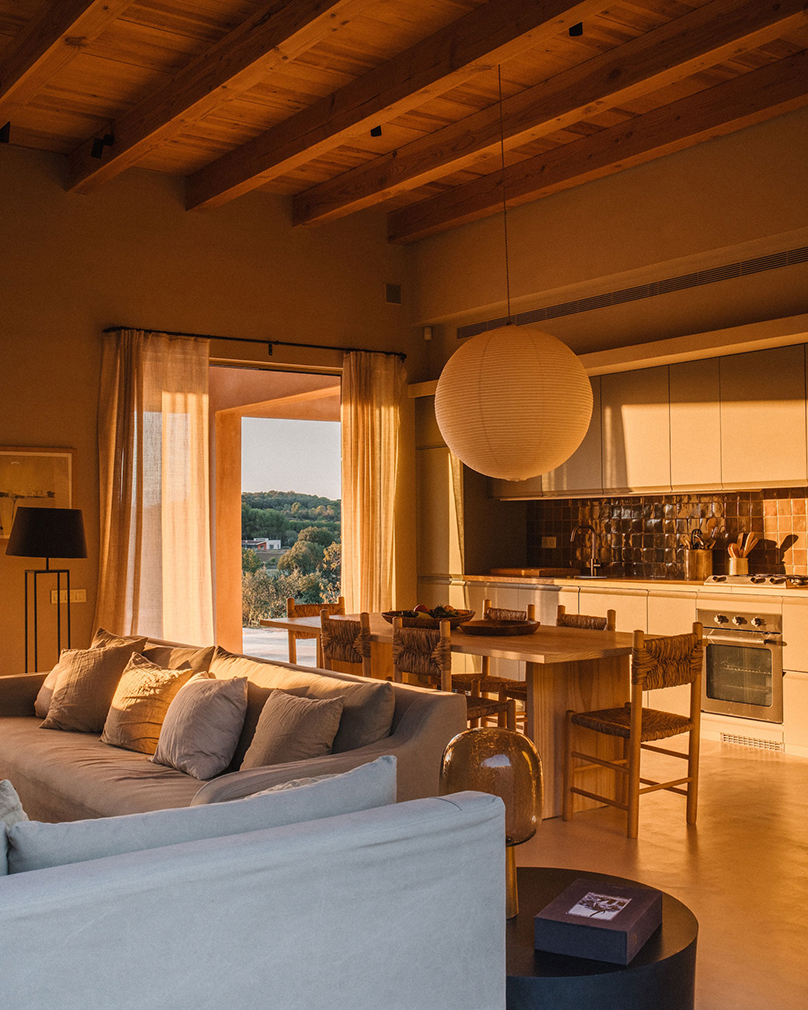 A deep opening cuts through the smooth ochre facade, framing a living room that looks directly onto fields and a distant tree line. Thick plastered walls, timber ceilings and sliding glass panels establish a calm interior, shaped by proportion and light. From the outside, this villa near Girona presents as a low, horizontal figure in the landscape, its form held close to the ground and defined by a natural palette.