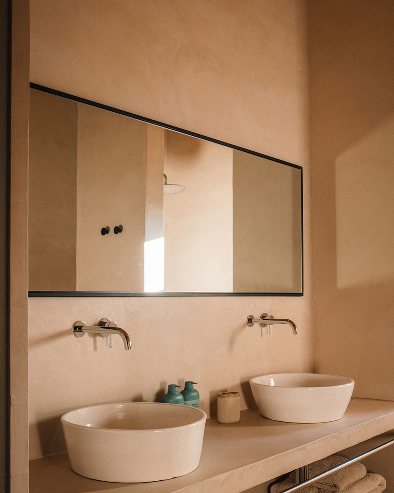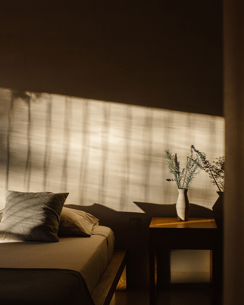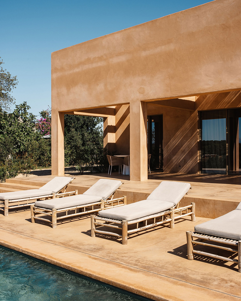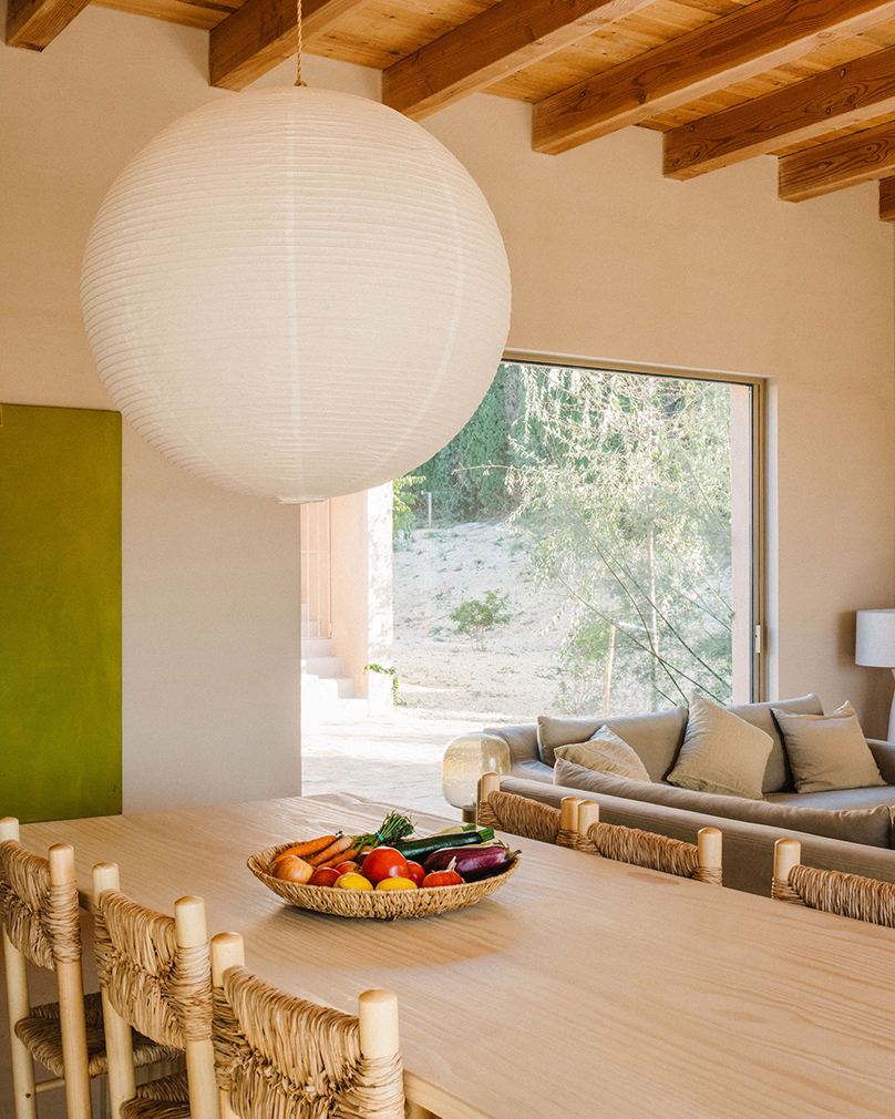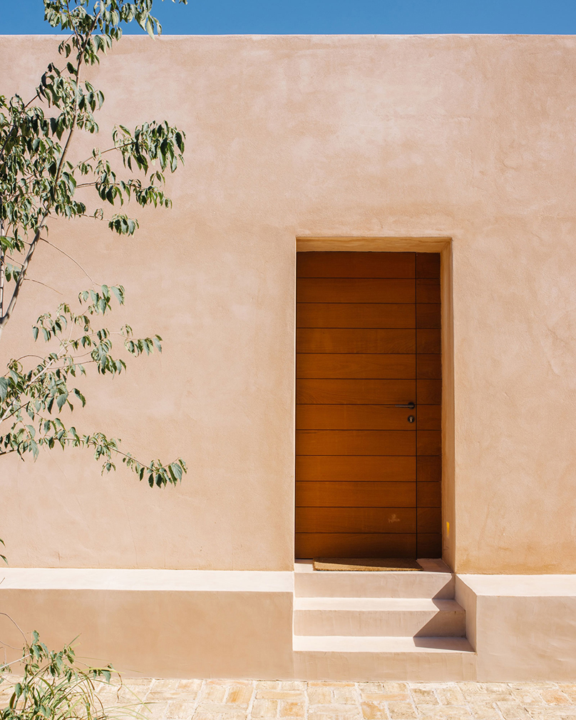 Known as Casa Terra, the house is organised as two near-identical modules arranged side by side. One contains the primary living spaces alongside a bedroom, while the second is given over to two further bedrooms, allowing shared and private uses to sit in parallel. Large openings draw the exterior inward across the plan, with shaded terraces extending the interior footprint and a pool aligned toward open countryside and the Pyrenees beyond. Interiors remain deliberately spare — plaster, wood and stone carrying the architecture — while underfloor heating, air conditioning and a fireplace support year-round use.