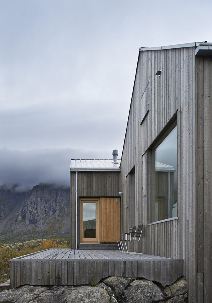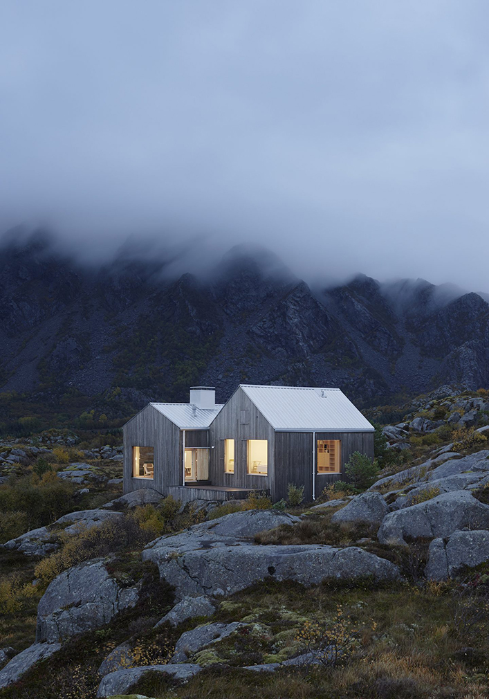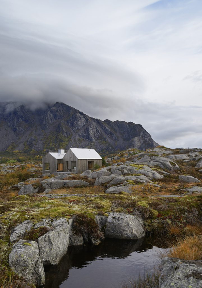 The cottage’s gabled silhouette riffs on the traditional boathouses found in Norway’s coastal villages, while its silvery pine skin blends into the lichen-covered rocky landscape.