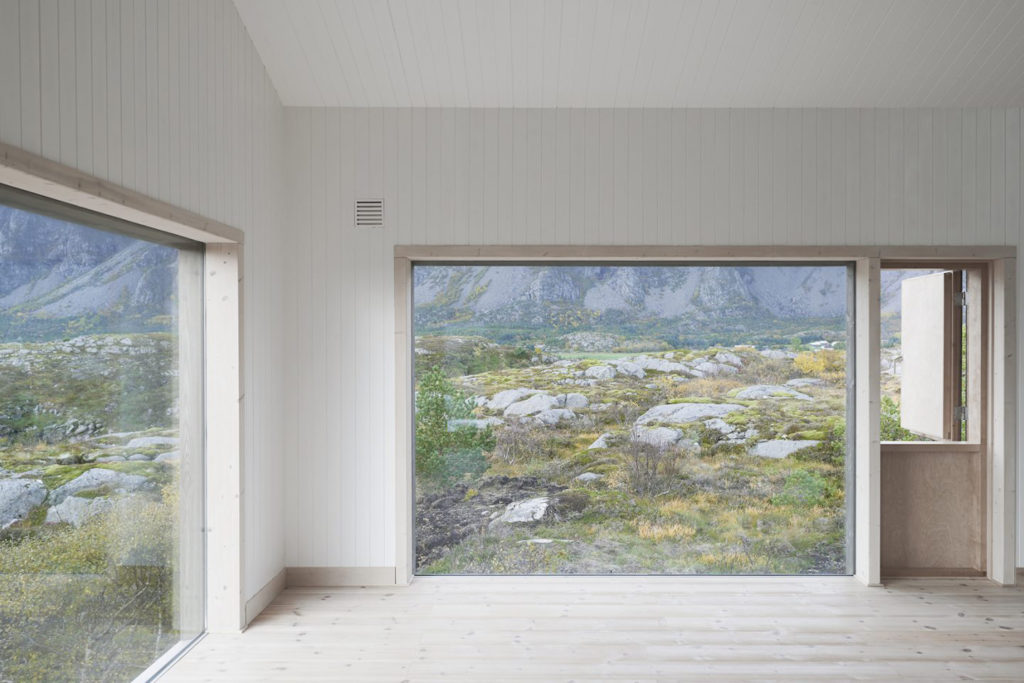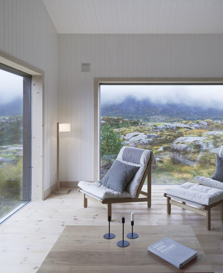 Interiors of the three-bedroom Norwegian holiday home hone a pared-back Scandi style. Oversized picture windows frame views of the sea and the mountains, while pale timber floors and walls add a sense of calmness, matched by minimalist furnishings.