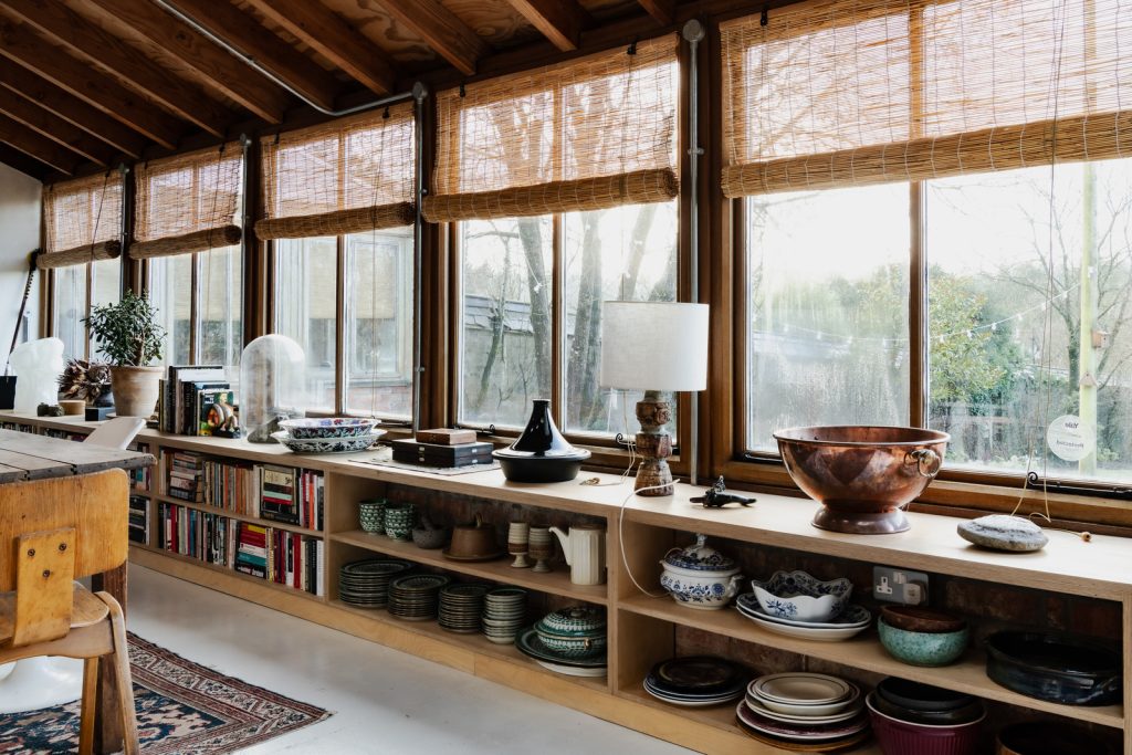 A sitting room adjoins, lit from above by skylights and anchored by a log-burning stove, with a study and bathroom branching off. The bedroom sits beyond, wrapped on one corner by timber-framed windows and skylights, with an en-suite bathroom defined by copper detailing and green glass brick. A separate studio of over 760 square feet adds further flexibility, with a mezzanine level and generous roof light.