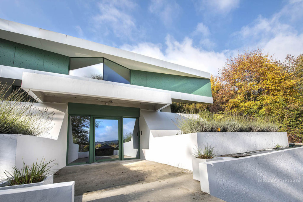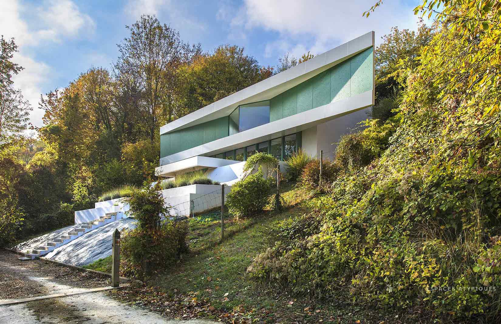 Architect Jean-François Susini of R2S Architects designed the geometric hillside home in 2016, and it appears as though wedged into the sloping plot like a shard of stone.