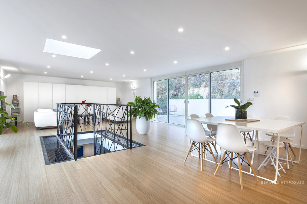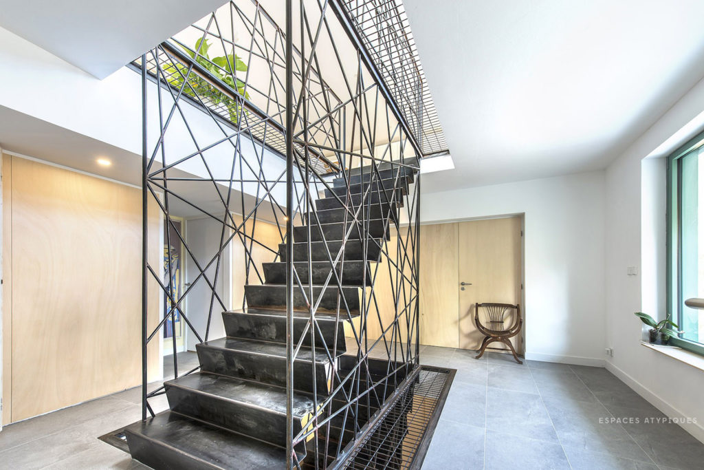 The four-bedroom French property is on the market via Espaces Atypique for €830,000 and has a ‘topsy turvy’ layout that unfurls across three levels and is anchored by a suspended central staircase.