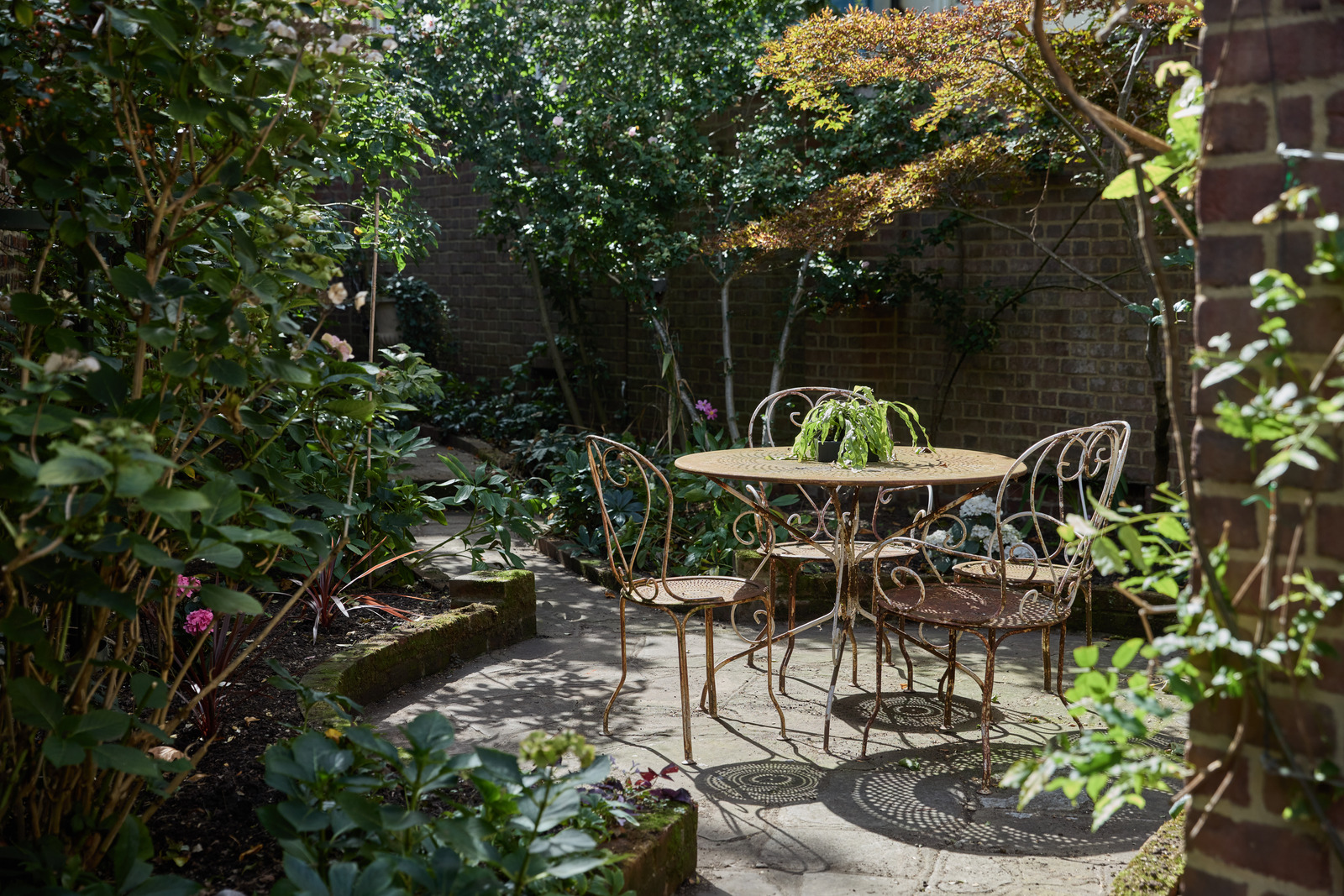 The bespoke DeVol kitchen, painted in Roman Plaster, incorporates original Delft tiles and underfloor heating. The piano nobile holds a bolection-moulded fire surround and a bay window overlooking 144 acres of Greenwich Park. The walled garden sits directly against its boundary. It’s listed for £2,975,000 with Inigo.
