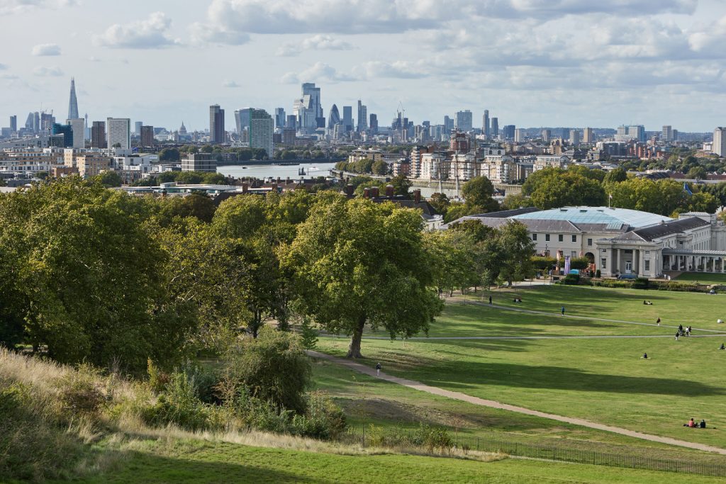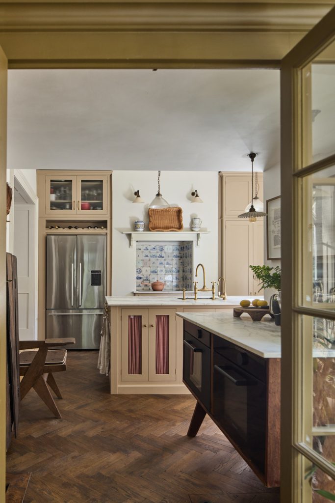 The bespoke DeVol kitchen, painted in Roman Plaster, incorporates original Delft tiles and underfloor heating. The piano nobile holds a bolection-moulded fire surround and a bay window overlooking 144 acres of Greenwich Park. The walled garden sits directly against its boundary. It’s listed for £2,975,000 with Inigo.