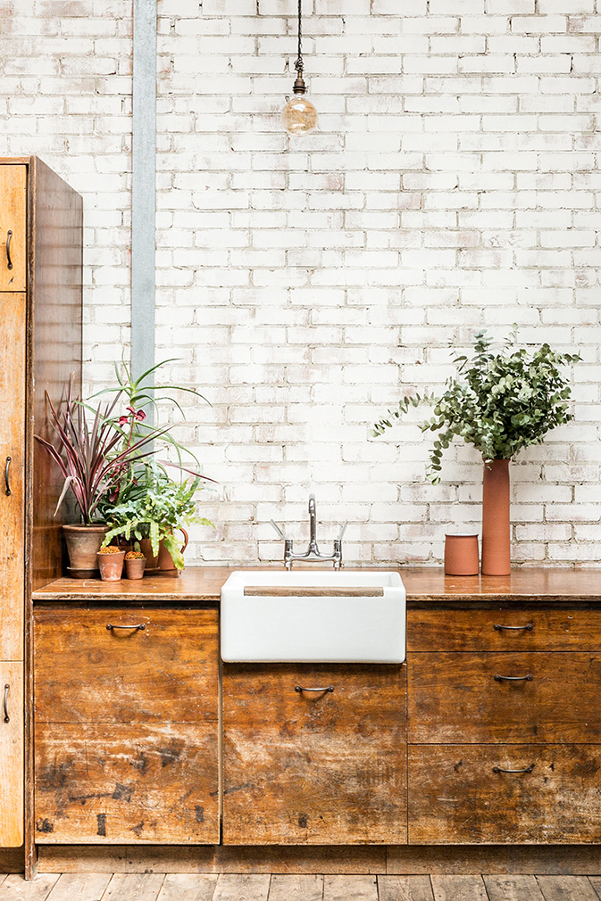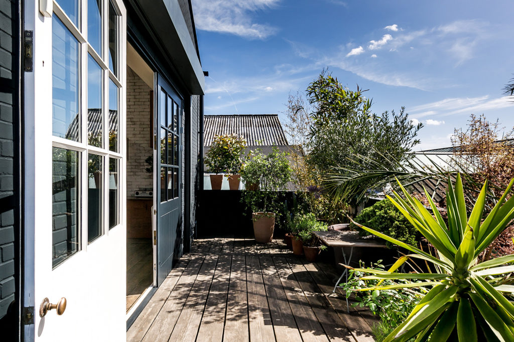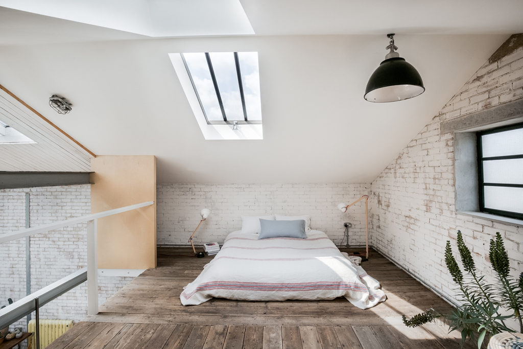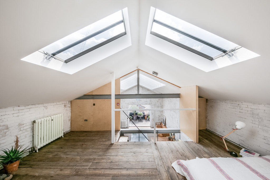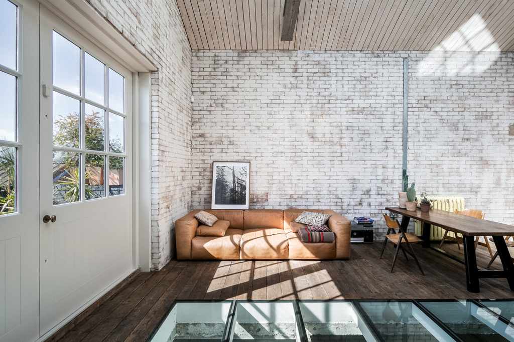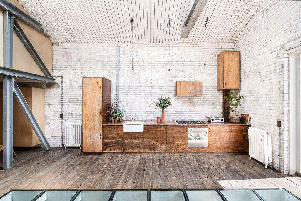 Bi-folding doors divide the open plan ground floor, which is used as a library and creative studio and features concrete floors and built-in storage. From here, a steel staircase leads up to the main living space above, which is decked out with salvaged wood and white-washed brick, while a mezzanine sleeping loft overlooks the living room.