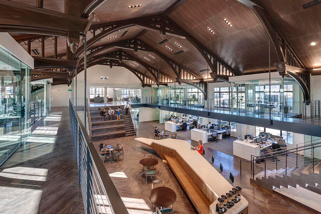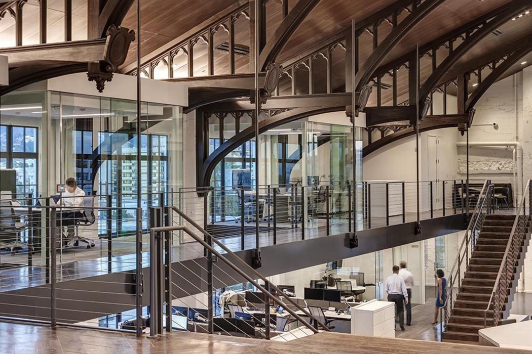 Caruso Affiliated’s rapidfire 10-month adaptive reuse project included the installation of 18 new 20-ft windows across the building to allow for better flow of light, while original windows on the front facade have been restored. The ‘vaulted cathedral-trussed penthouse’ has been turned into a meeting space, kitted out with stadium seating.