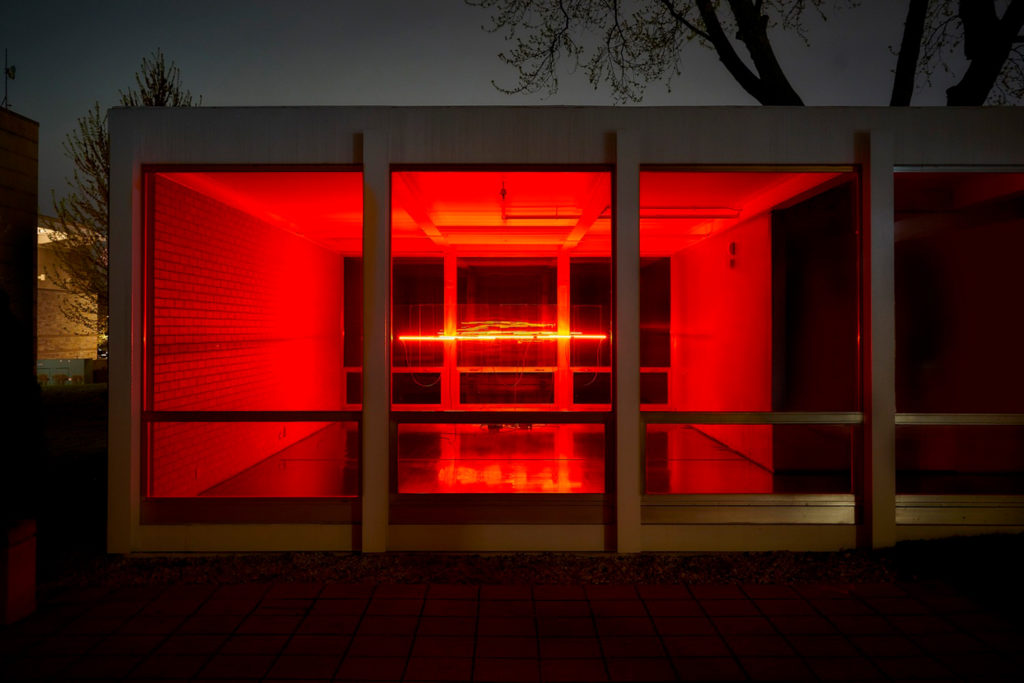 The house dates back to 1952 and was a prototype for a set of prefab homes proposed for the city. Luftwerk’s Parallel Perspectives exhibition references an early idea by the property’s developers to tint the windows of the housing in rainbow colours.