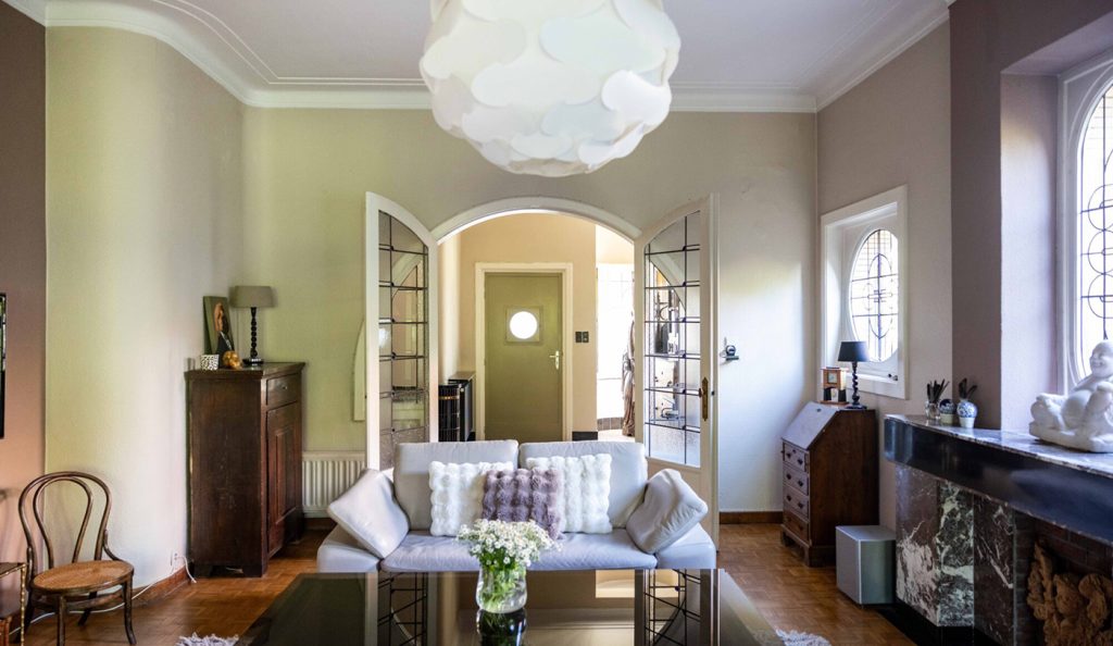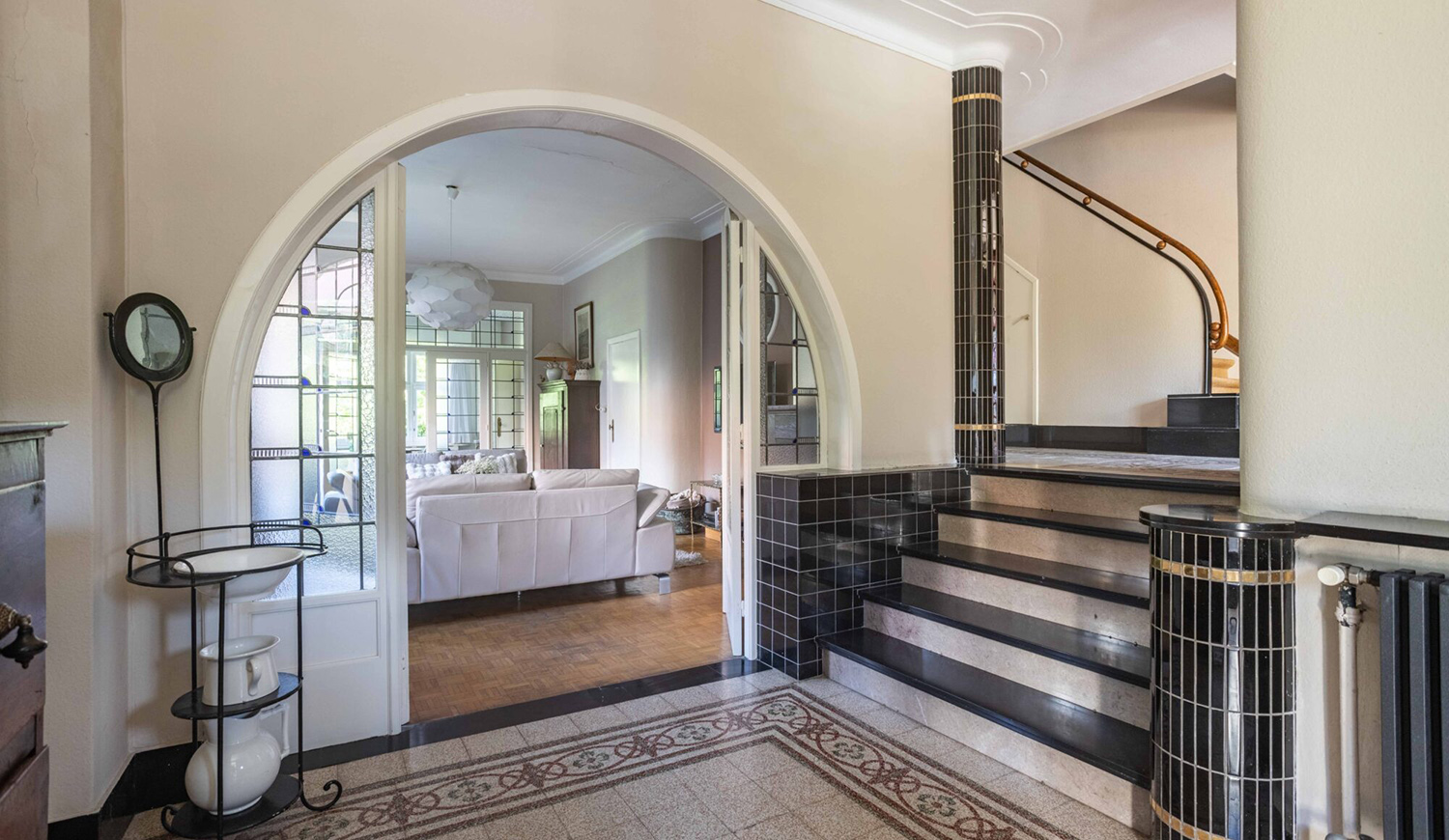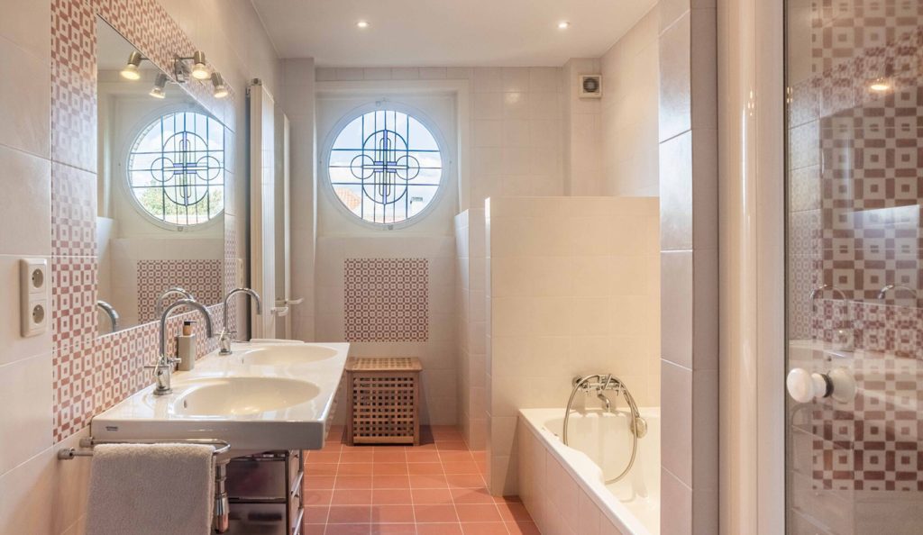 Each villa spans around 275sqm across multiple levels, with three to four bedrooms, a basement, attic and garage. Their interiors retain original features, including herringbone parquet, geometric mosaic floors and stained-glass doors that choreograph light through connected living spaces. South-facing rooms open to leafy gardens at the rear, while the elevated entrances create a sense of privacy from the street.