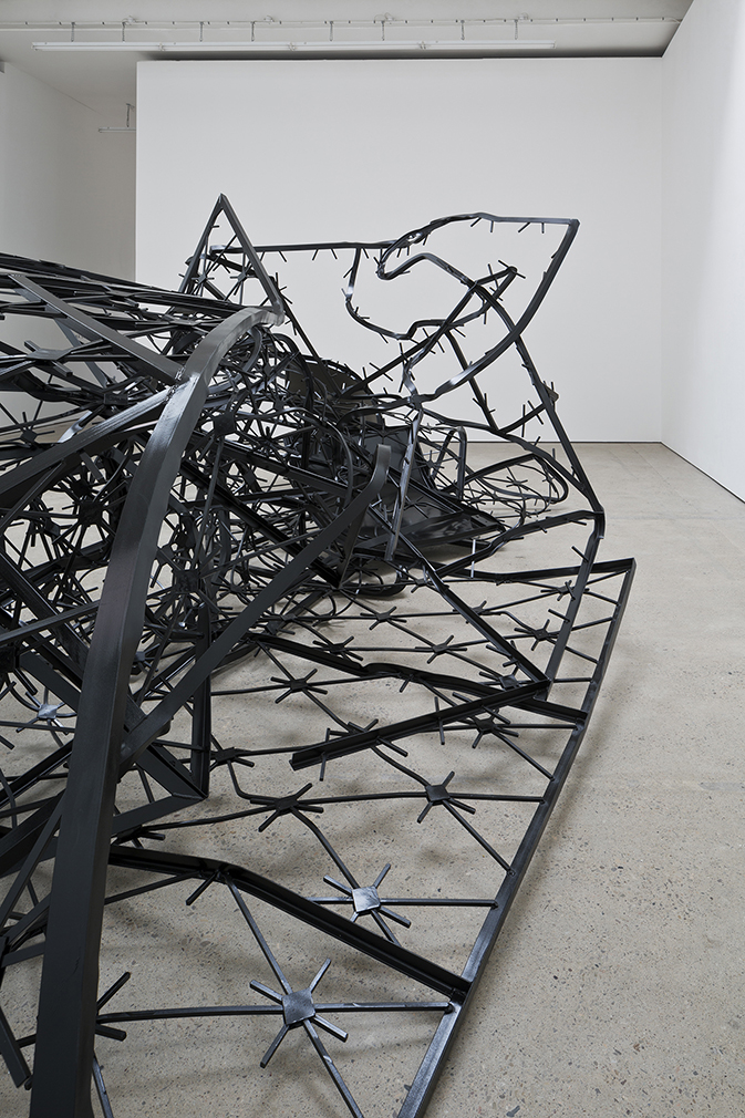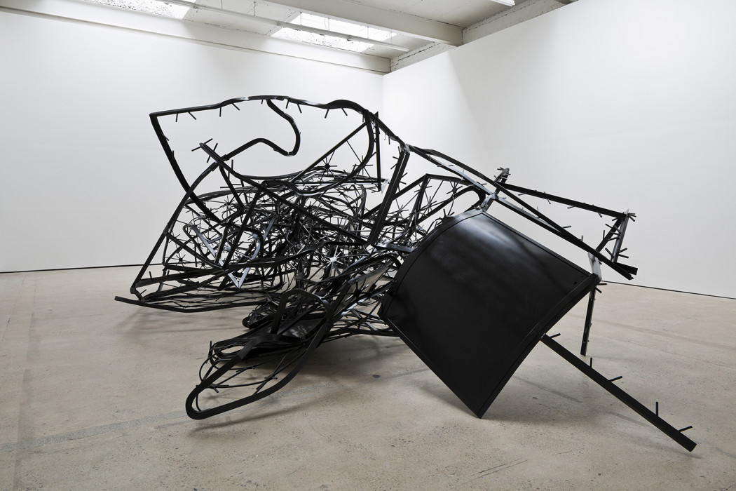 Four smaller sculptures are shown on a grassy square outside the gallery. Made from tubular steel and painted in municipal green, they derive their root forms from Hansen’s balustrades, playground equipment and a carpet-beating rack. The outdoor setting suggests that their alarming warped forms might be the result of some unpleasant natural disaster.