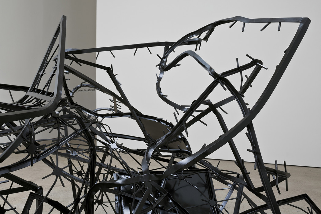 Precise steel copies of elements from the Osiedle Słowackiego development in Lublin – including part of a shopping pavilion, and playground equipment – act as raw material for Sosnowska’s dramatically twisted new sculptures showing at Glasgow International.