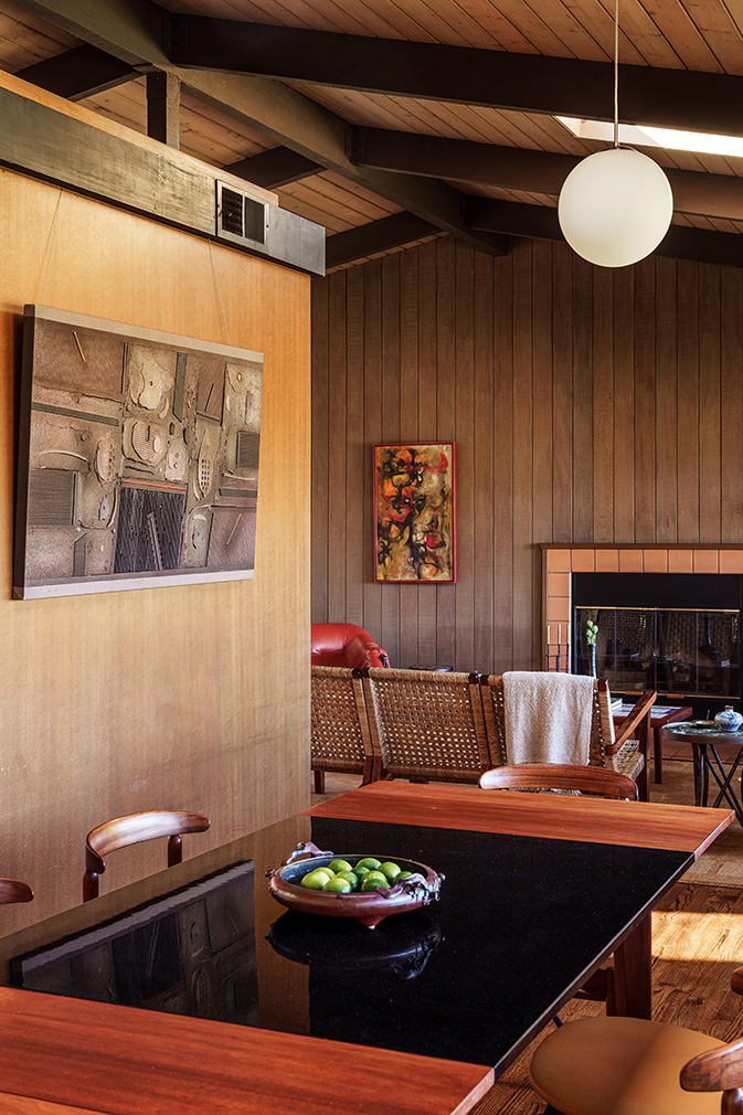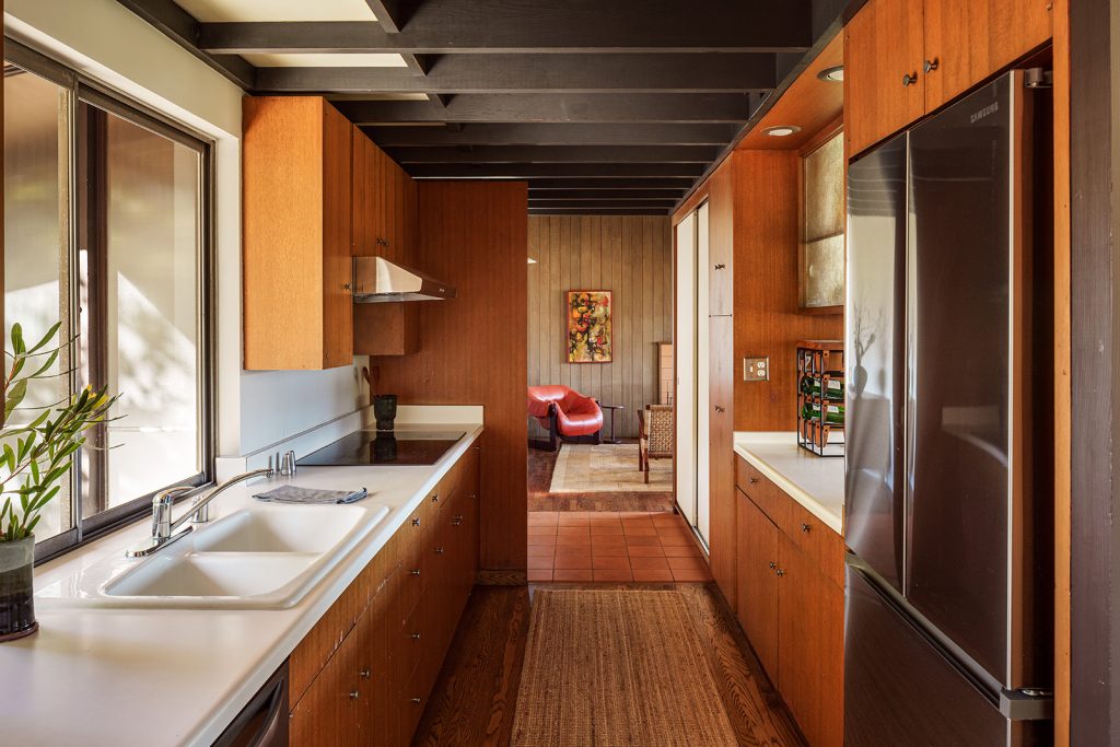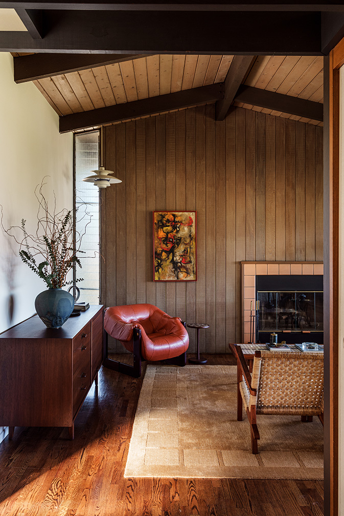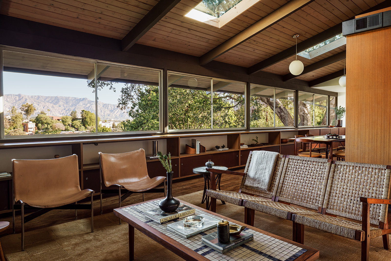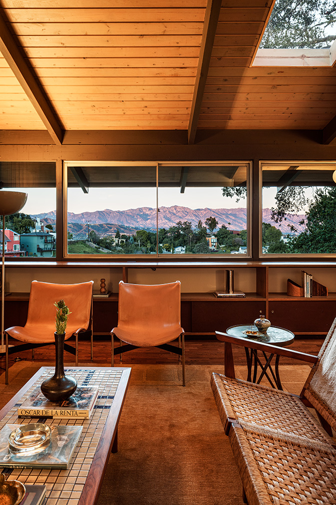 The 1,731sqft interior is arranged across three bedrooms and three bathrooms, set over two levels. Living, dining and kitchen spaces occupy the upper floor beneath vaulted timber-beam ceilings, where long bands of glazing frame views over the canyon toward the San Gabriel Mountains. Original millwork and cabinetry remain intact, defining zones within the open plan while preserving clear lines of movement. Terracotta tile at the entry, a gas fireplace and discreet skylights reinforce the material consistency of the house and bring light deep into the interior.