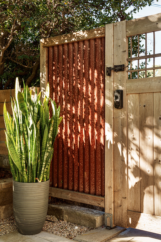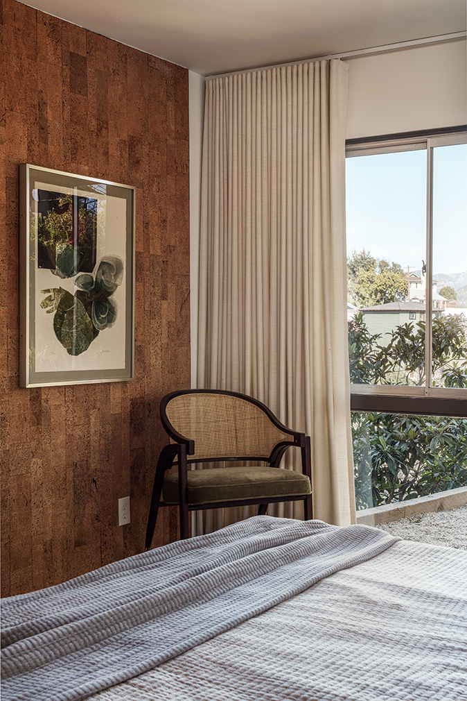 Bedrooms are positioned below, including a primary suite with original built-ins, cork wall detailing and a soaking tub finished in glazed ceramic tile. Outside, a walled courtyard and stepped terraces unfold beneath a mature live oak, extending the house into its landscape. Set on a double lot, the property remains closely connected to its Mount Washington context and the trail network beyond.
