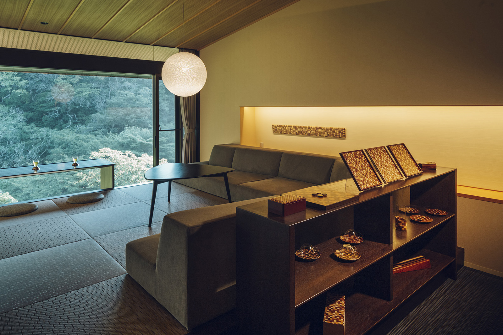 pays homage to this heritage. Located on the wooded riverbank, it operates a revitalised open-air onsen bath and transformed rooms with vast windows onto the tree canopy. Inside, low-frame furnishings with locally woven linens pivot toward the river views. Wood trim and original artwork incorporates traditional yosegi-zaiku elements, and visitors can partake in a programme of cultural workshops in new ‘cultural discovery’ centre, focusing on time-honoured wood inlay techniques.