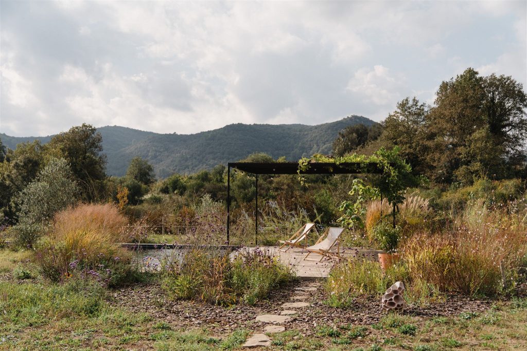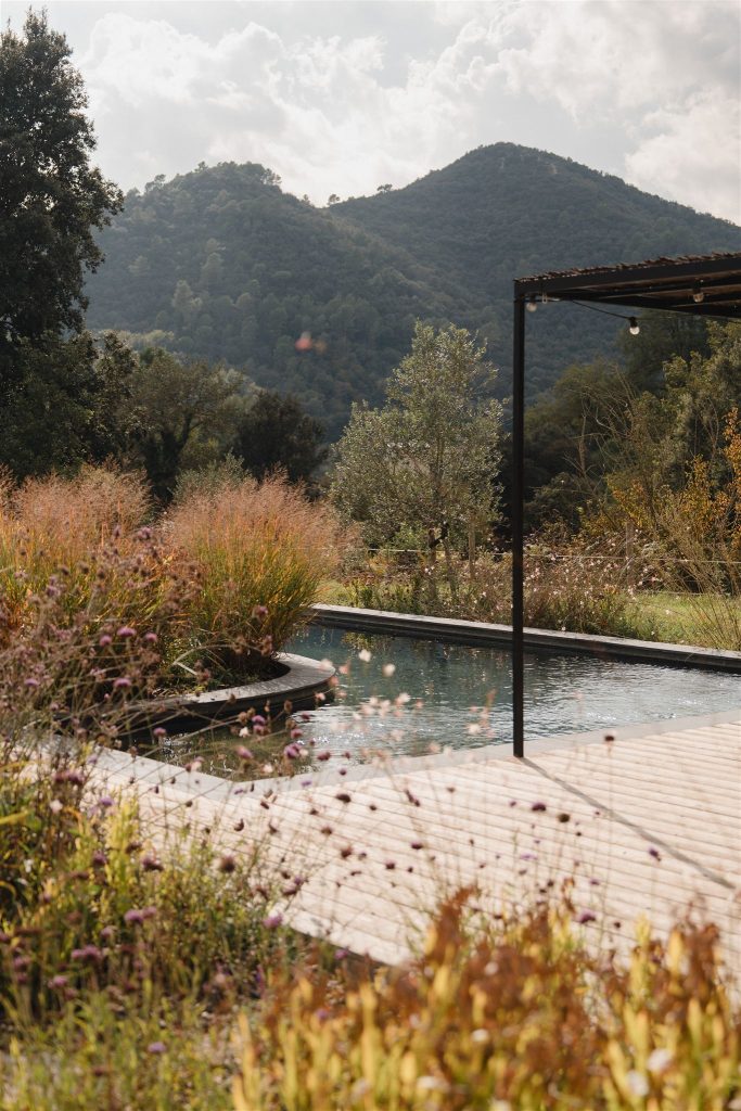Outside, four hectares unfold in orchards, woodland and permaculture gardens, with a pool as a centrepiece that settles naturally into the landscape. The restoration, completed in 2016, combines local materials and solar technology for year-round comfort. A short track links the property to the nearest village, while Girona and the Costa Brava lie within easy reach.