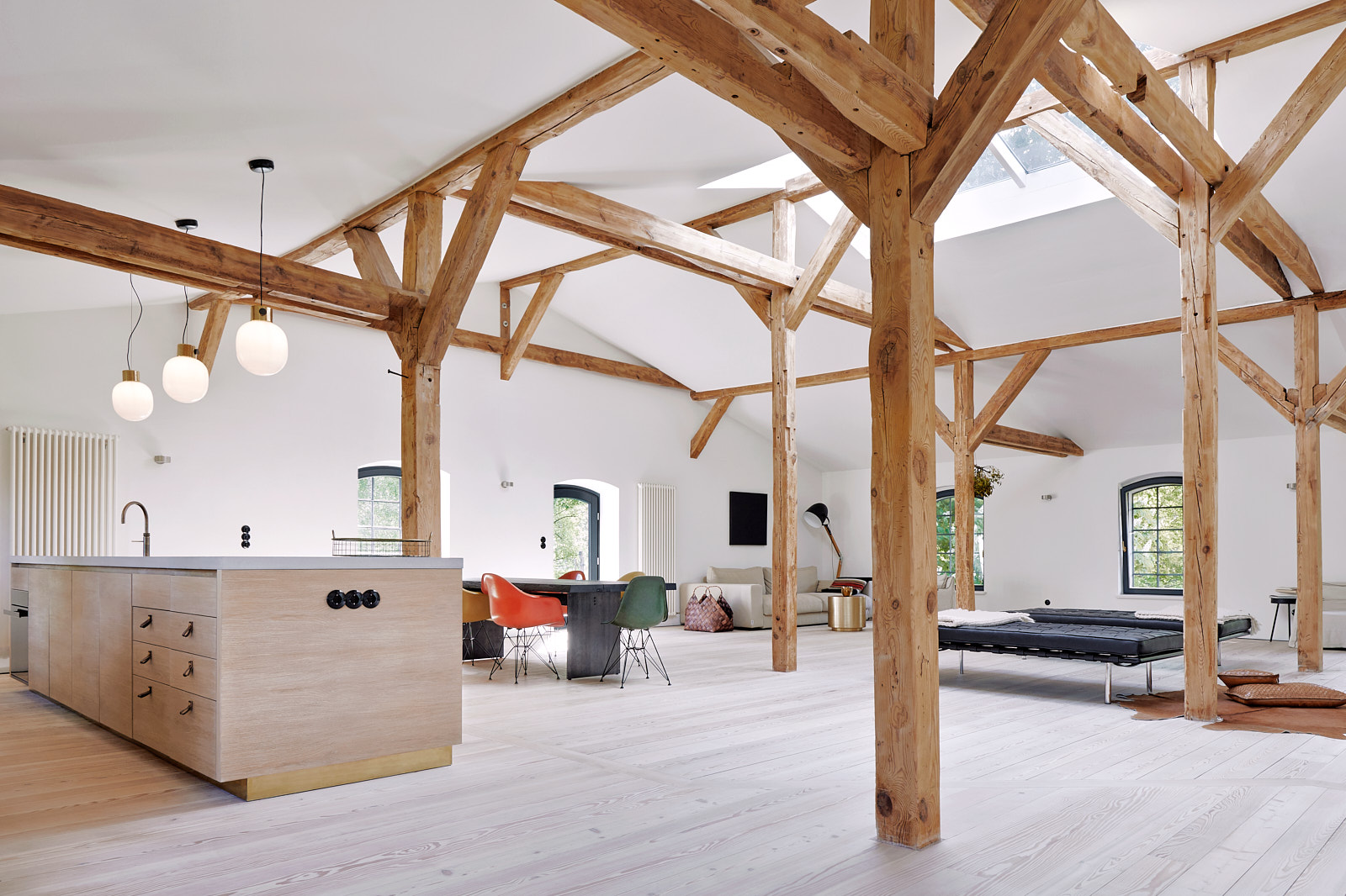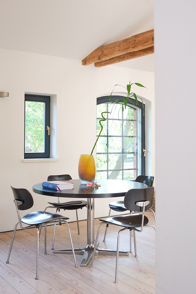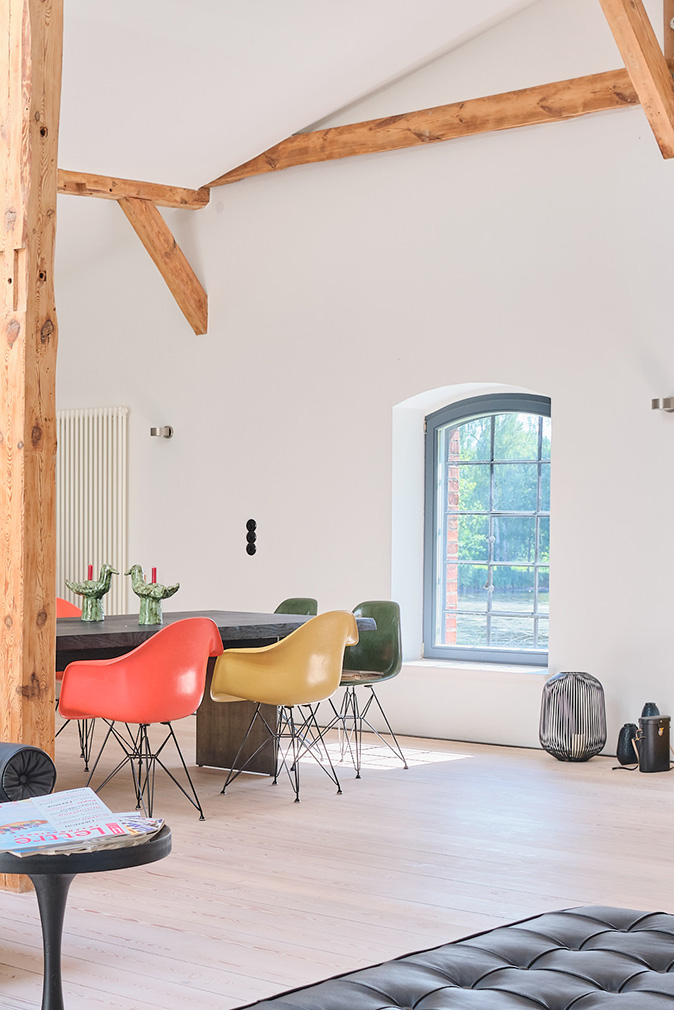 Completed in 2021, the renovation was led by architect Daniel Schöning in collaboration with developer Martin Blau. The approach retained the mill’s structural framework, with exposed historic beams, restored and soaped timber floorboards, and original elements such as the millstone incorporated into the interior. These sit alongside modern interventions including underfloor heating, modern bathrooms and updated building services.