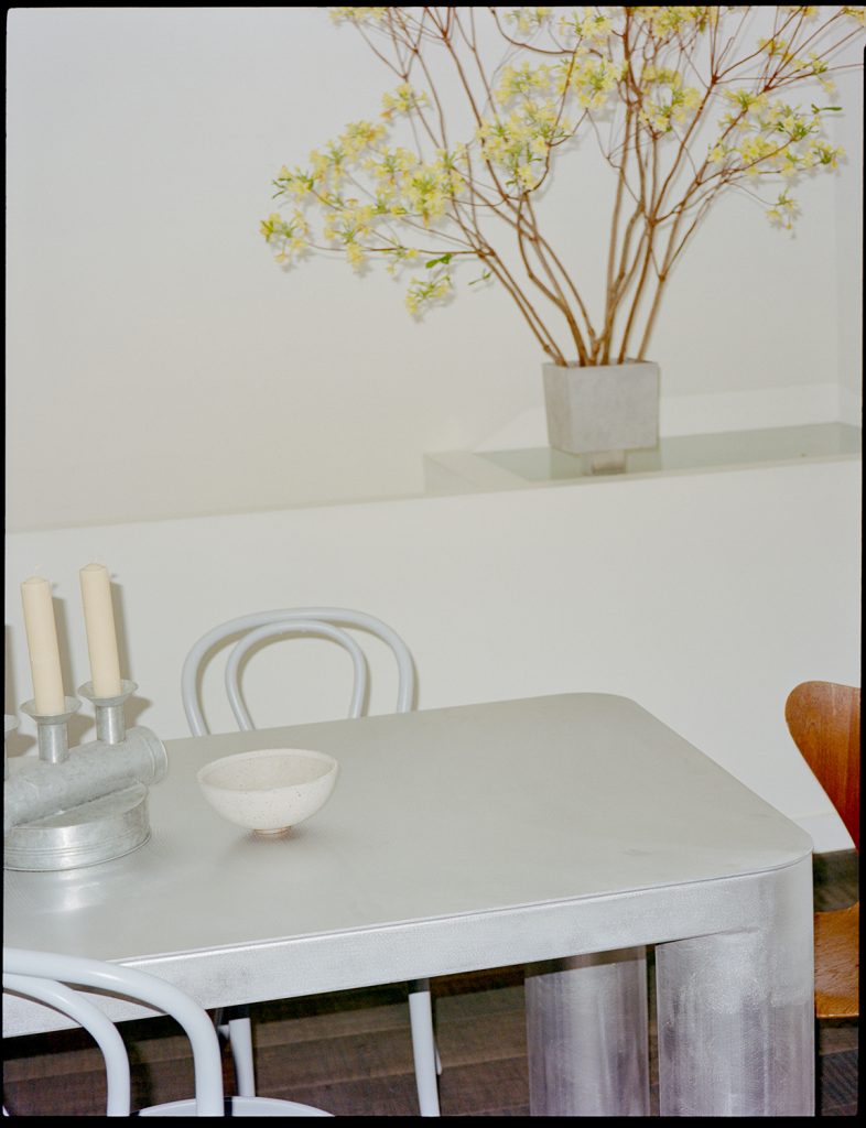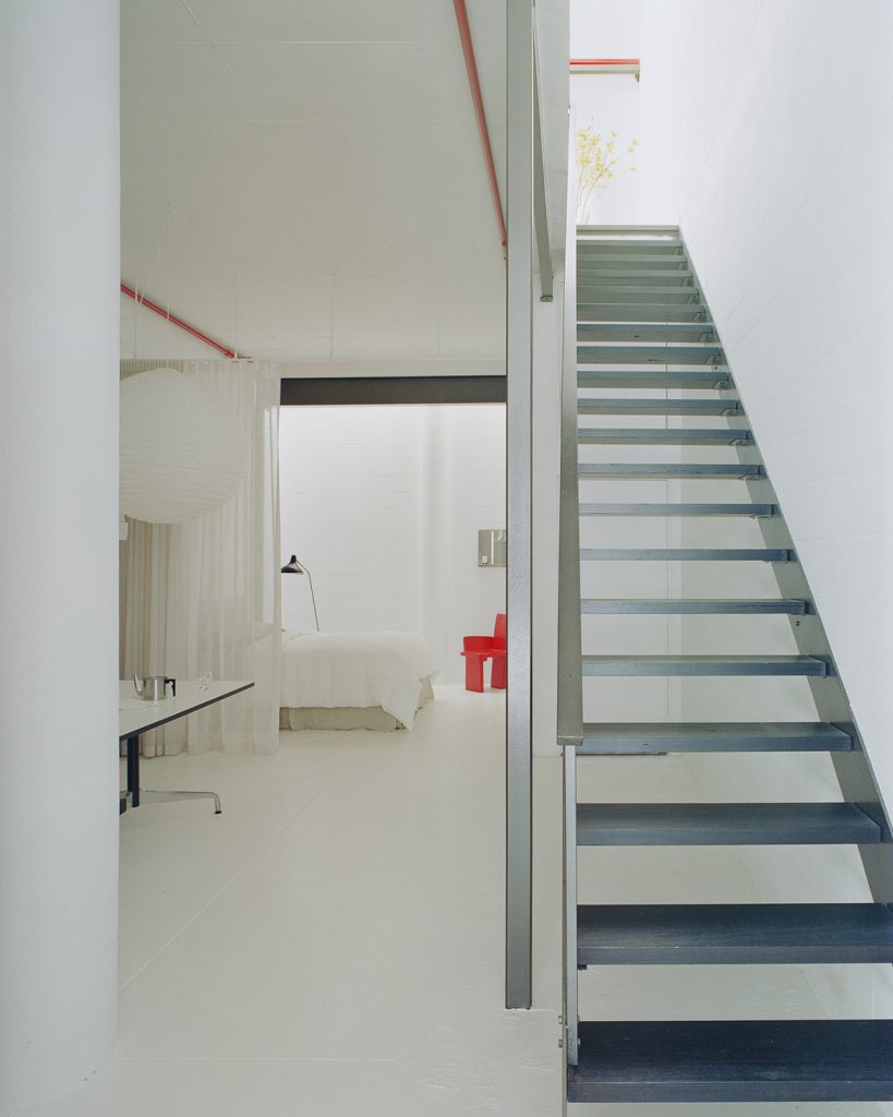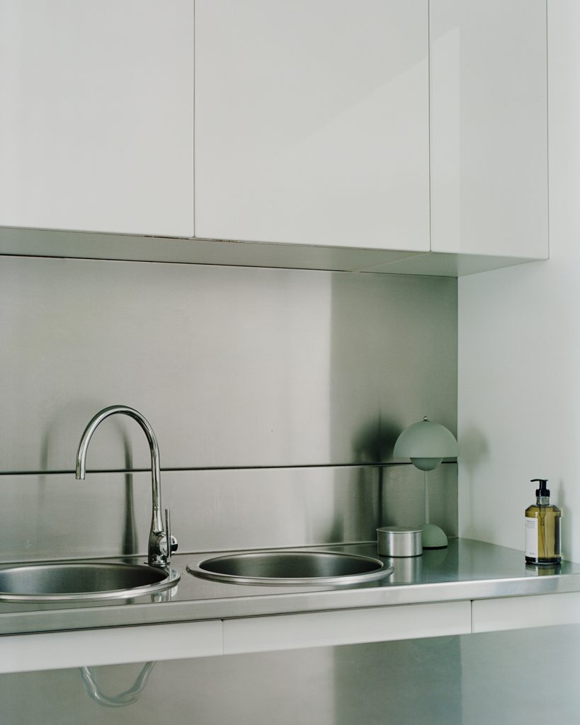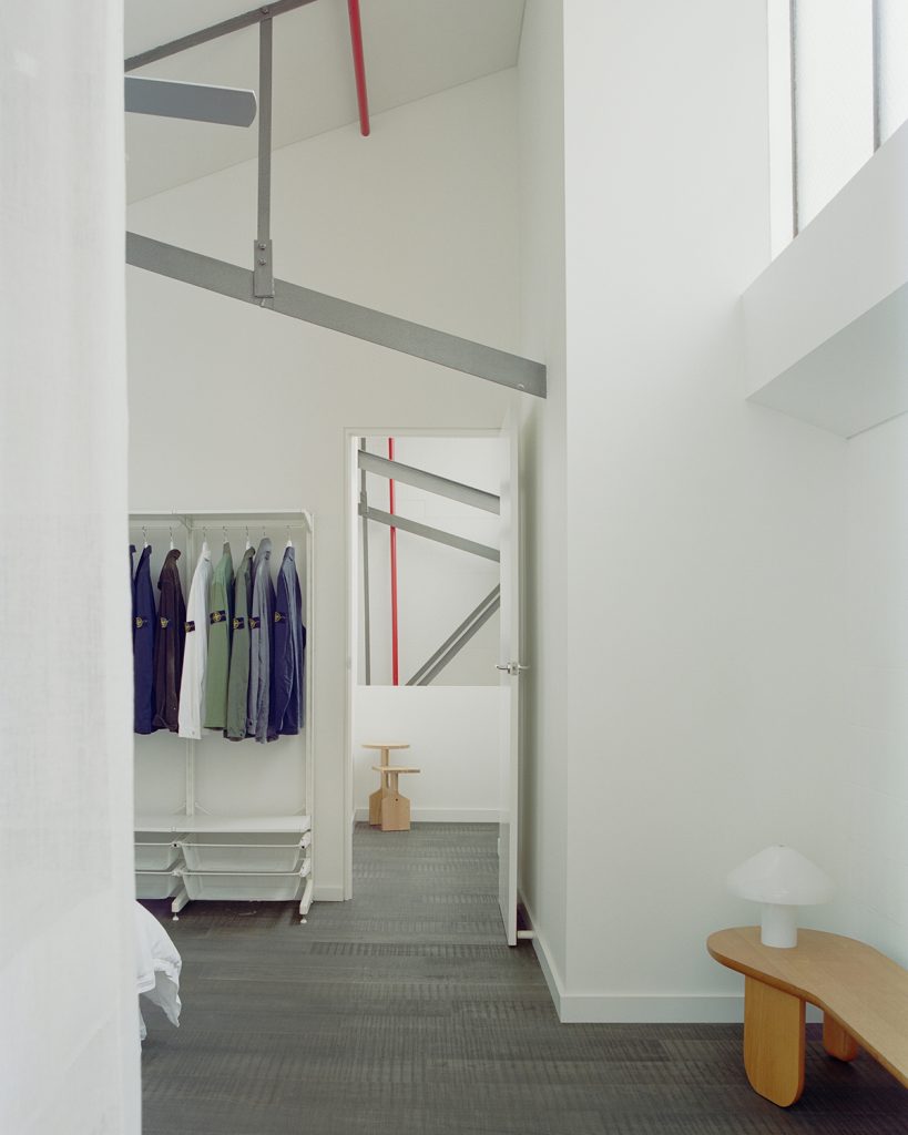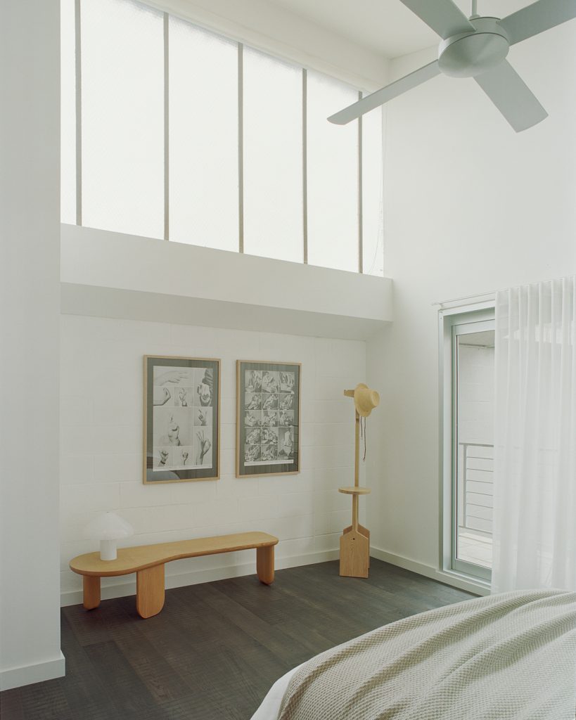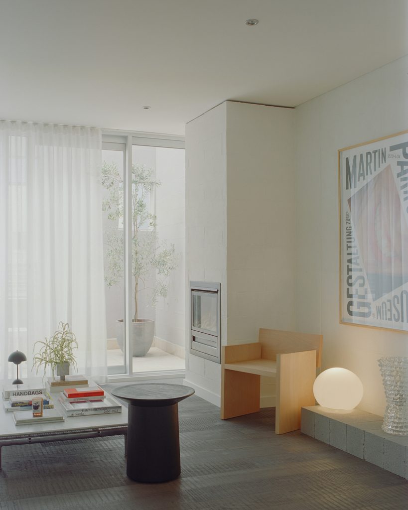 The three-level plan opens with a generous concrete-floored area that once served as an entertaining zone and now flexes easily between guest bedroom, studio or workspace. Above, the main living level unfolds under expansive volume — a pared-back palette of white, stainless steel and black timber emphasises the building’s architectural bones. Two balconies extend sightlines outward while drawing in daylight across the open-plan kitchen, dining and living areas. The top floor houses a private bedroom suite, shaped by the same instinctive minimalism that guides the whole restoration.