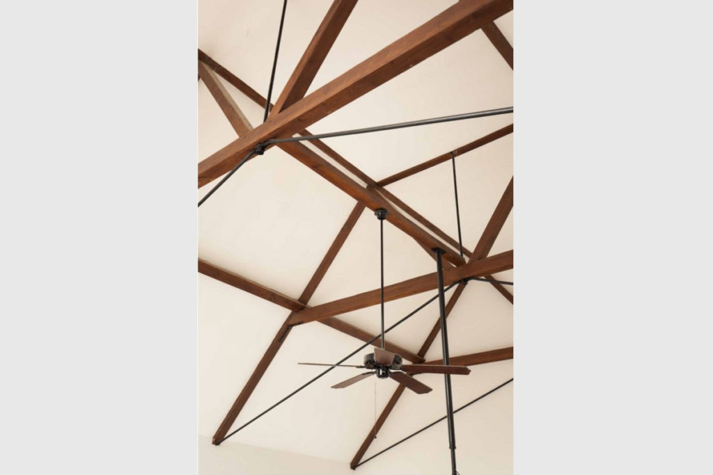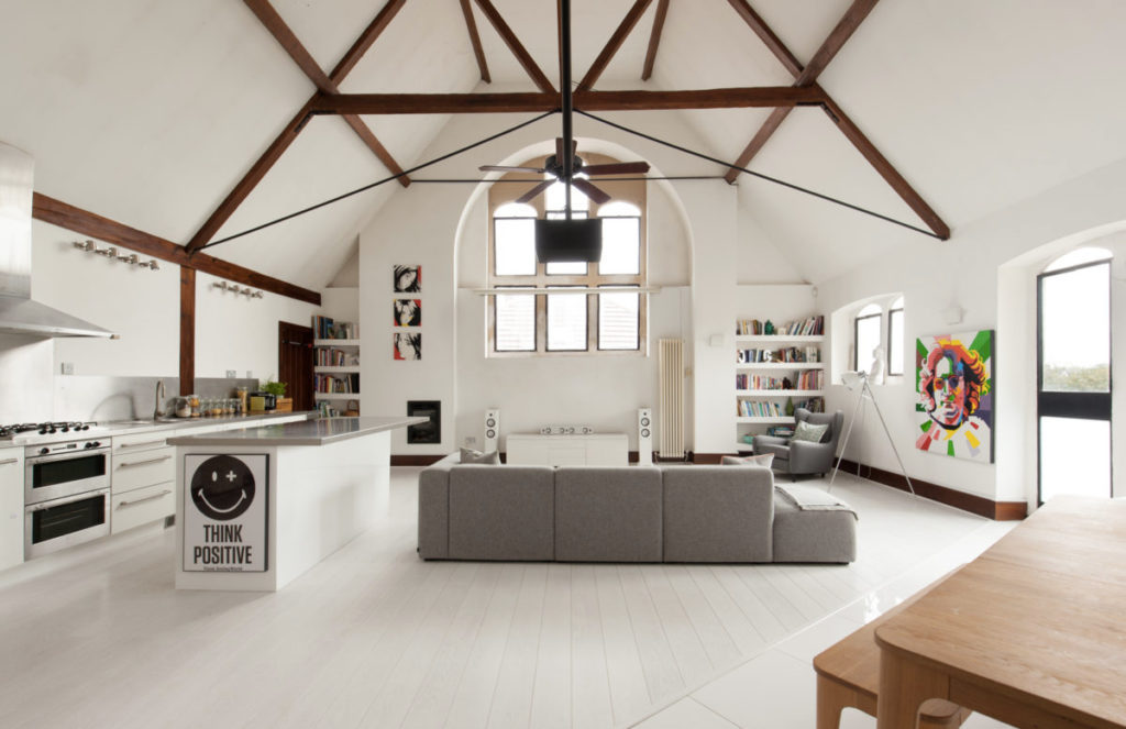 The three-bedroom converted school retains the pitched ceilings and wooden trusses of its former life, with the loft’s layout comprising an open-plan kitchen, living and dining room.