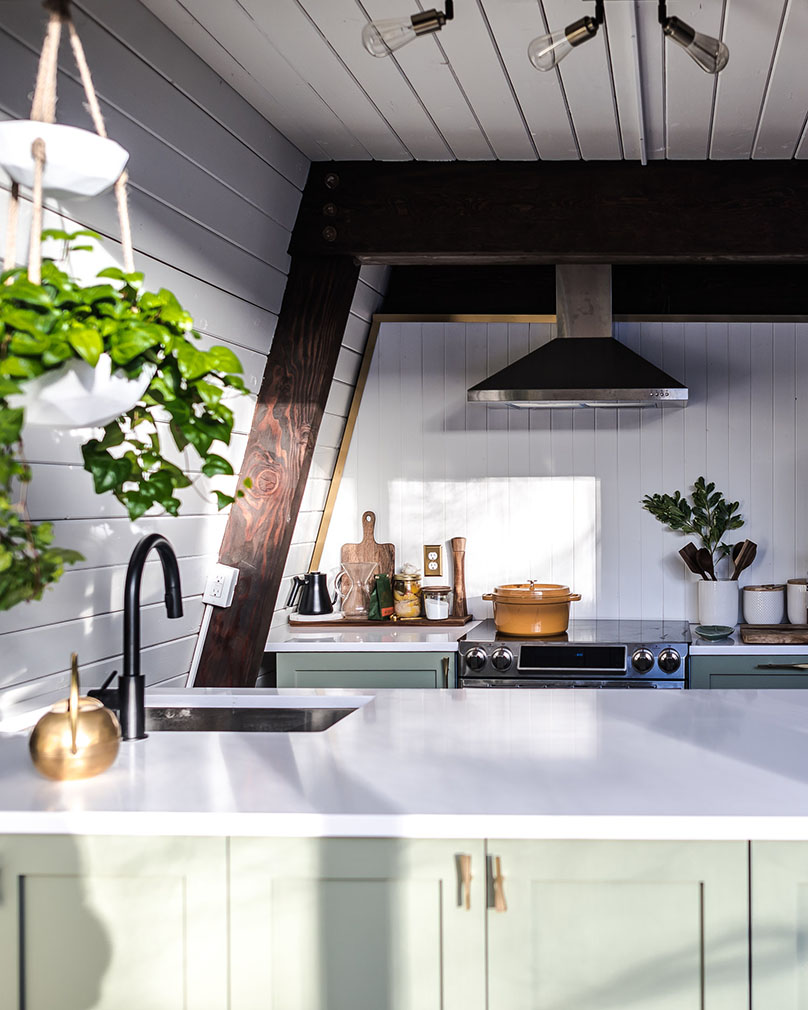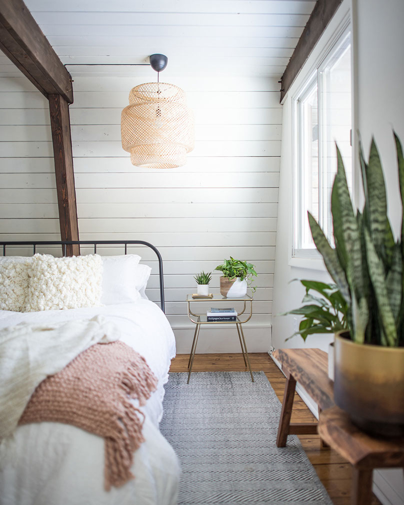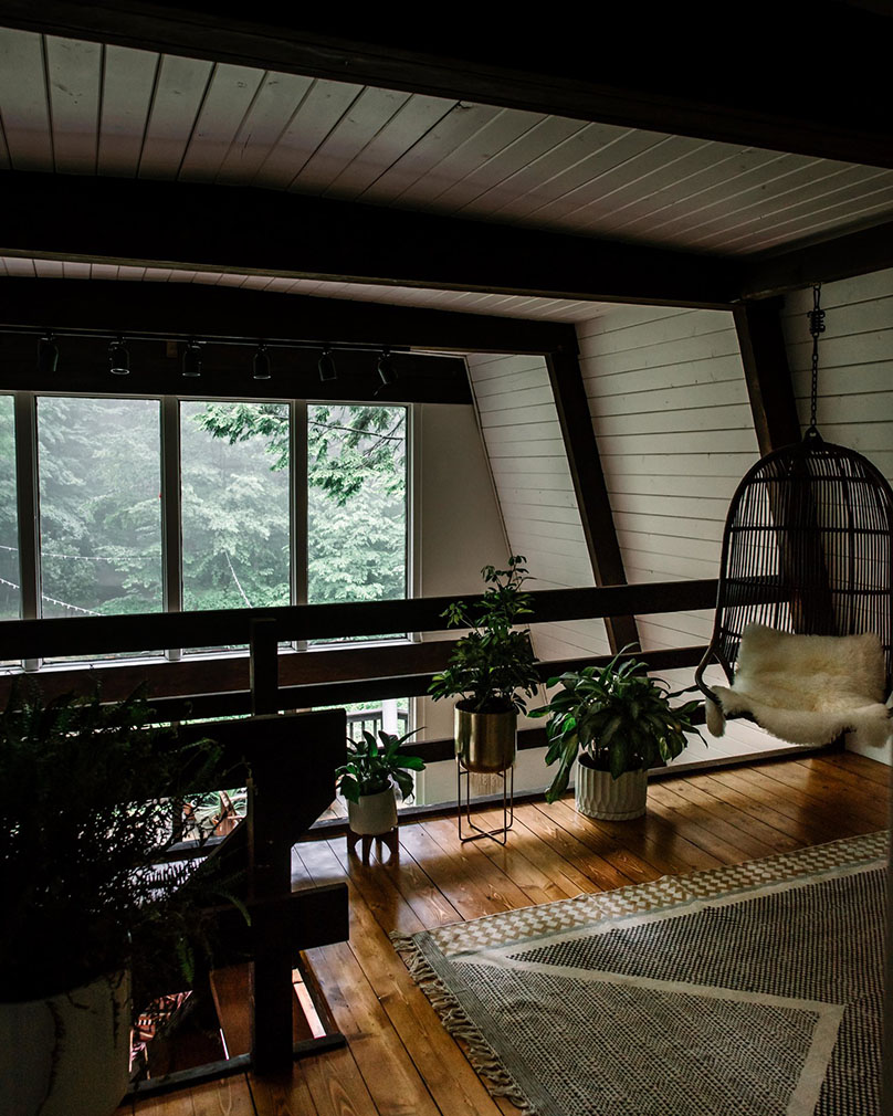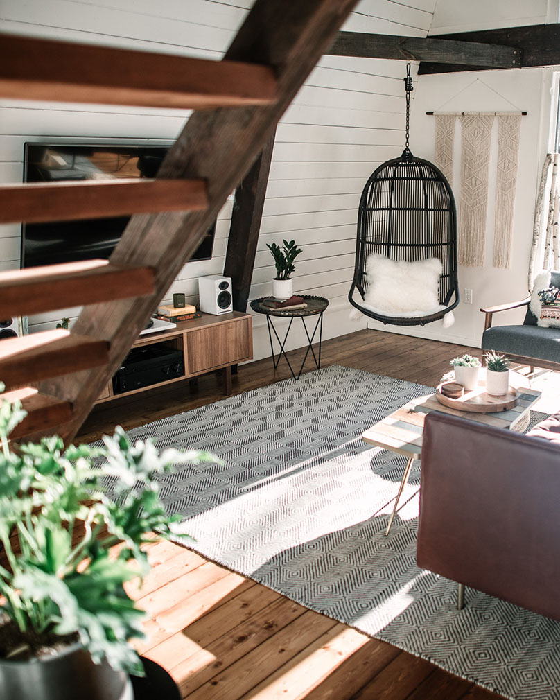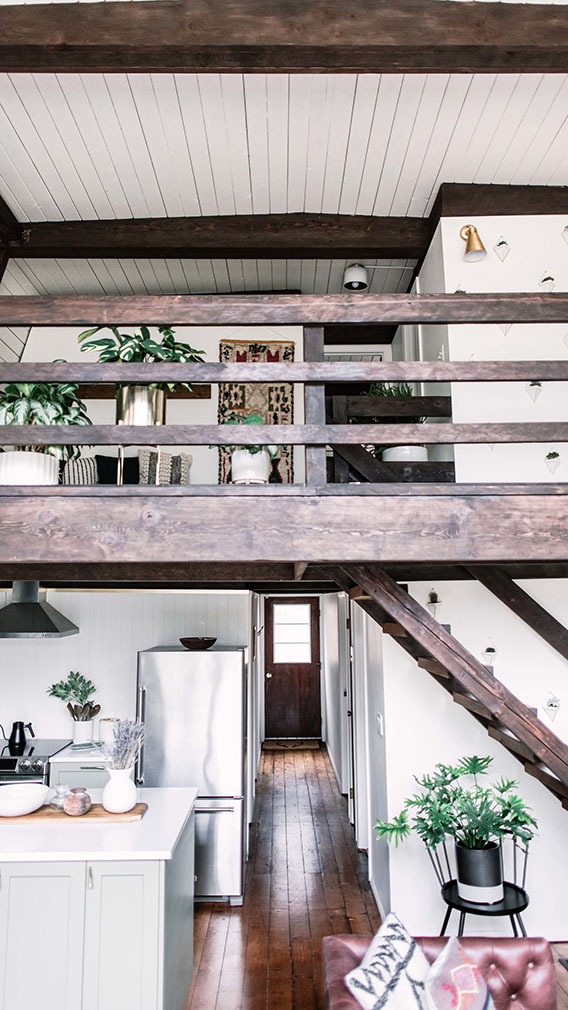 They white-washed its timber walls and highlighted its best features: 16-ft-high ceilings and a huge front porch looking out onto the woodlands. Original hardwood floors were exposed inside the three-bedroom home – available to rent via Airbnb from $329 per night – as well as lofted beams, hung with plants.