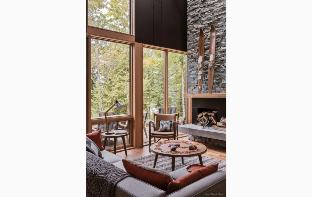 The Bear Stand was built by practice Bohlin Cywinski Jackson in 2016, some three hours north of Toronto, and it combines Modernist principals with rustic woodland living. A glass entrance leads into a sunken, two-storey Great room where an enormous granite fireplace takes centre stage and vast glass planes look out onto the surrounding trees and property’s 100-acre plot.