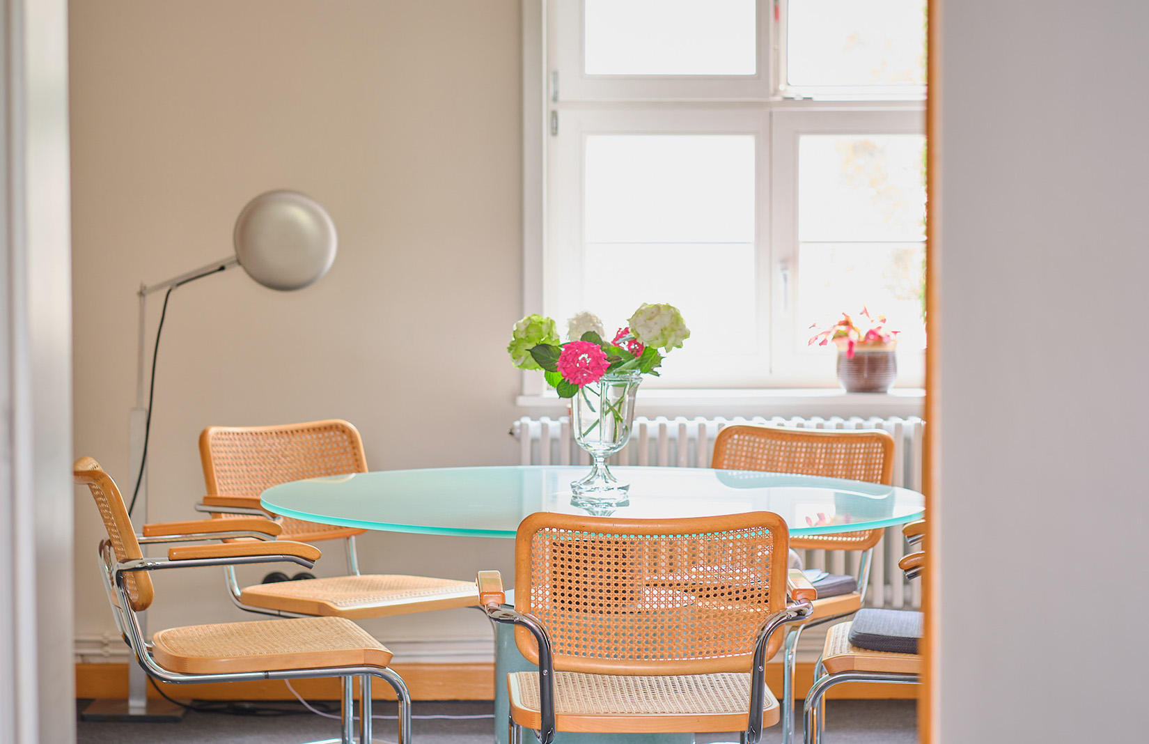 Beyond the main volume, the building contains three separate apartments, each carefully restored with original colour schemes, doors and fittings intact. Two inner courtyards introduce quiet outdoor rooms into the plan while additional studio and workspace areas sit at lower-ground level. The project received the Brandenburg Heritage Conservation Prize in 2021 and stands as a considered example of adaptive reuse. It’s currently offered for sale with OTHERHOMES.