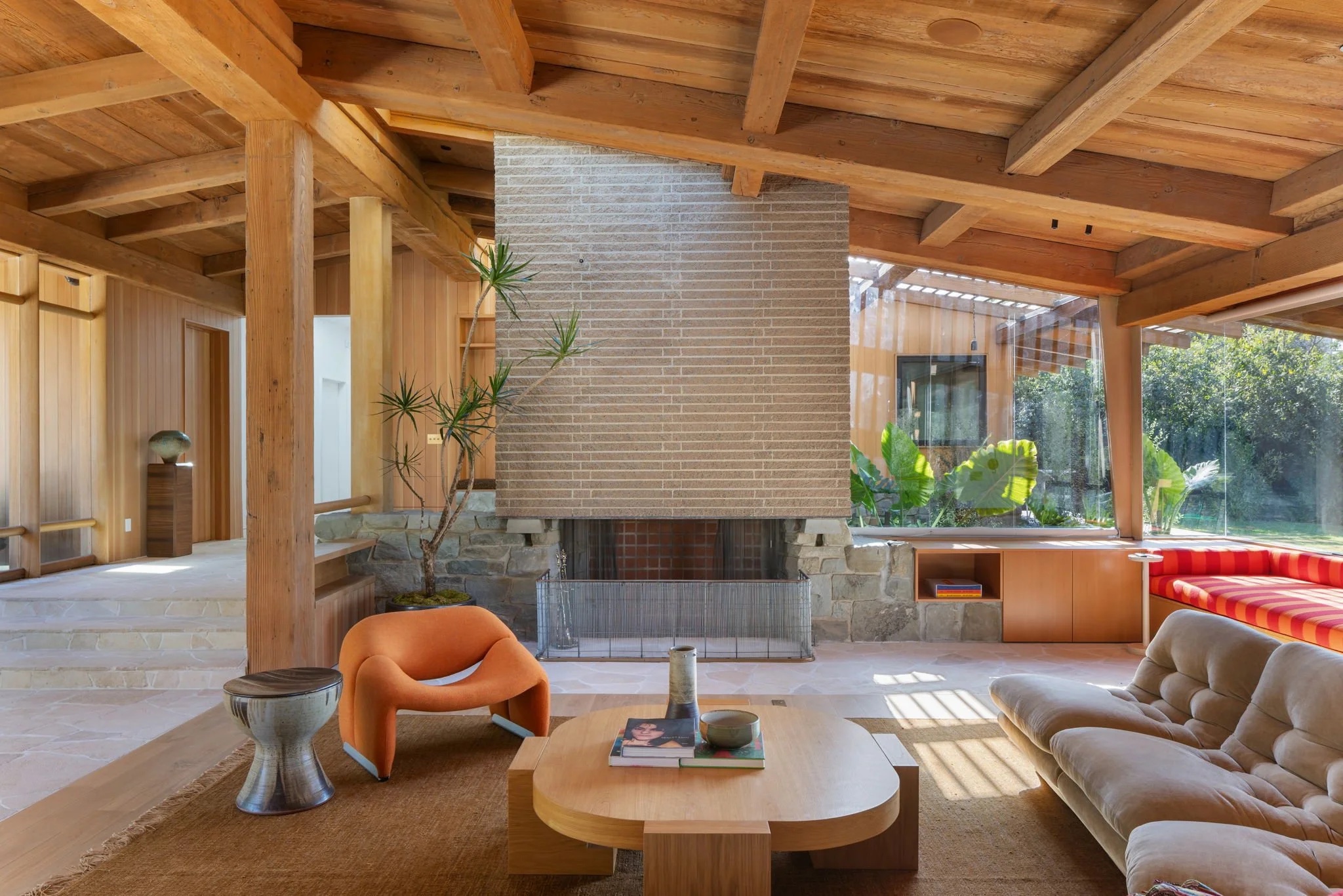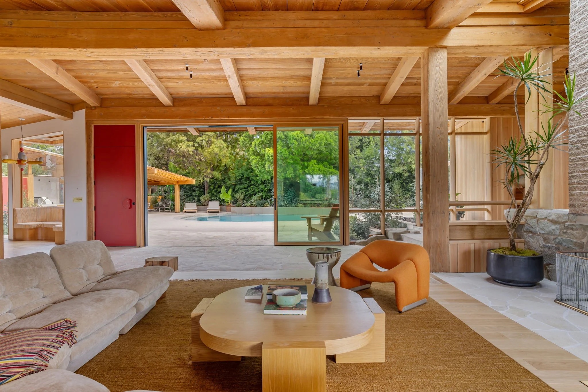 At the centre of the plan is a large great room, where sliding glass walls open directly to terraces, gardens and the pool. An original old-growth timber ceiling and fireplace remain in place, anchoring the space and reinforcing the home’s mid-century lineage. Living, dining and kitchen areas are arranged laterally, each oriented to natural light and views toward the Santa Monica Mountains and the Pacific Ocean beyond. Douglas fir is used extensively throughout, paired with hardwood and stone floors.
