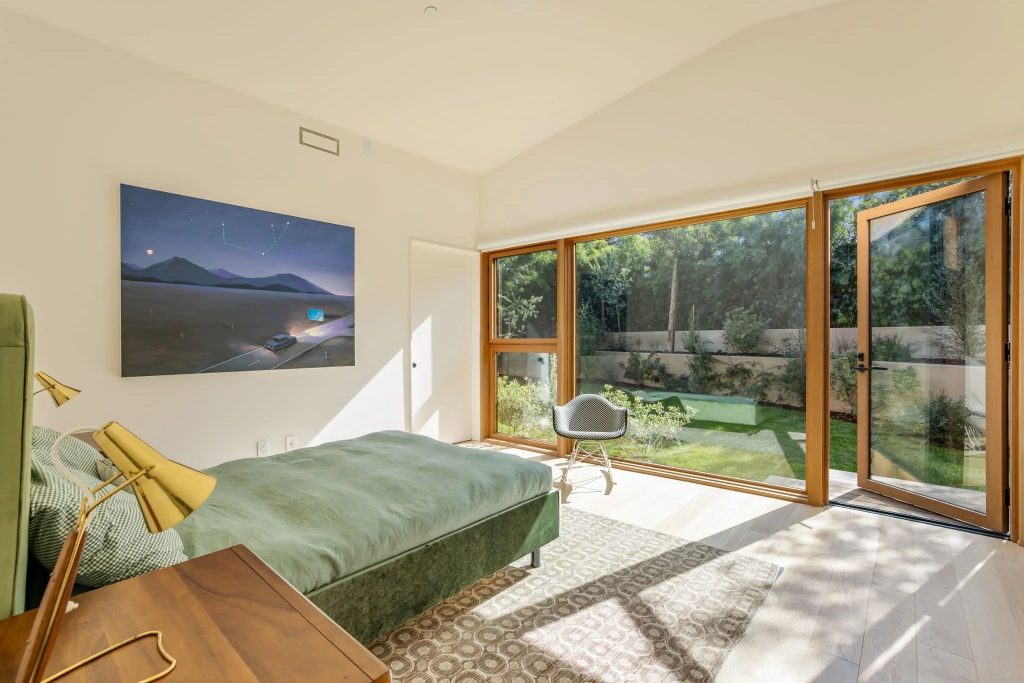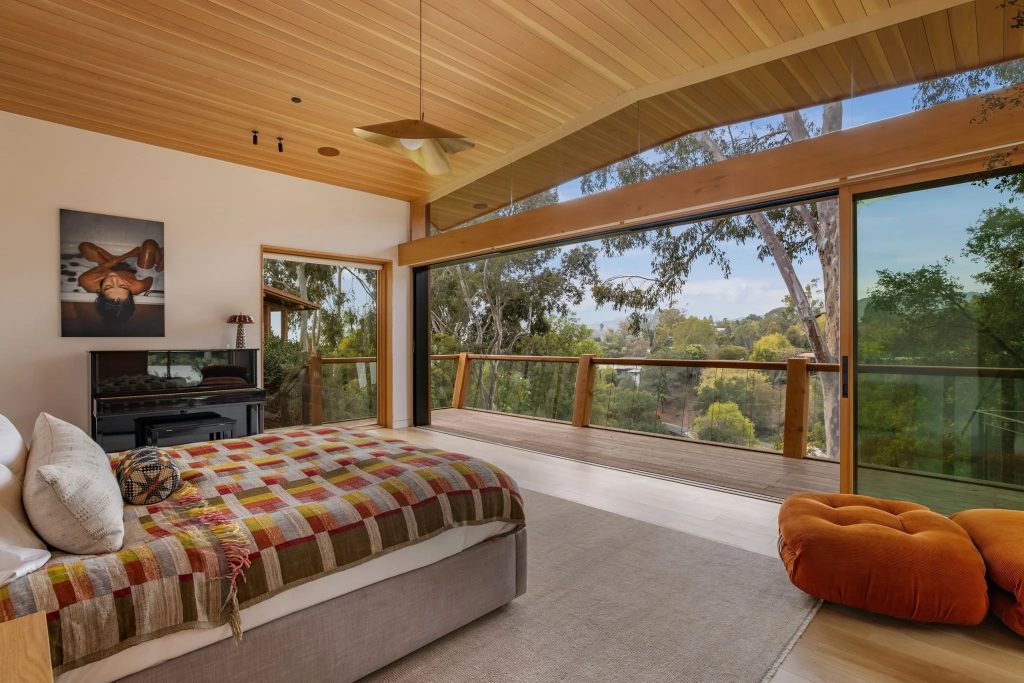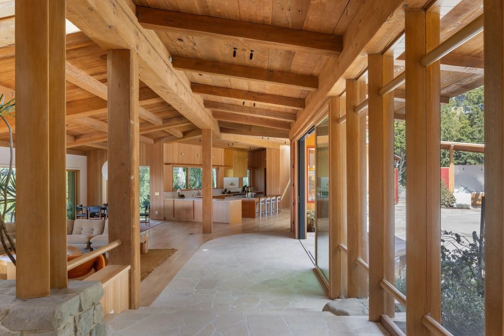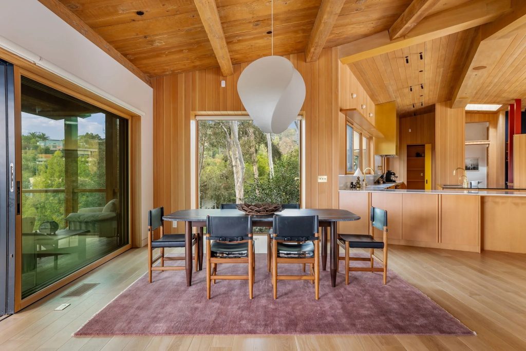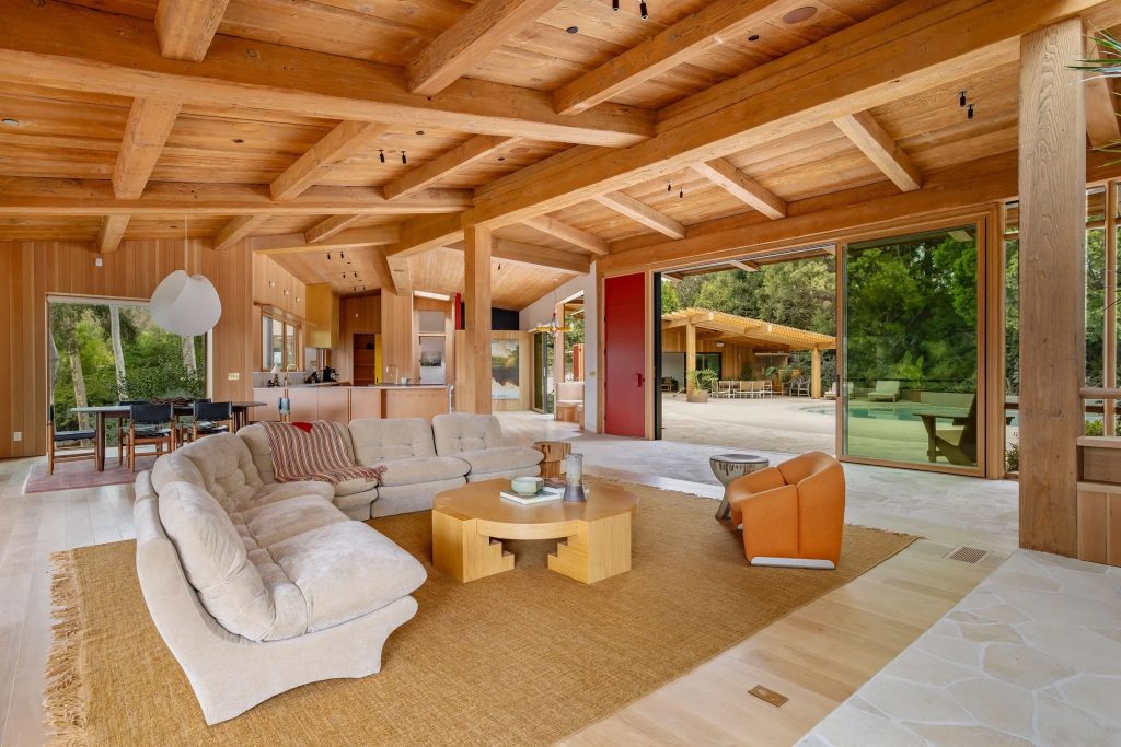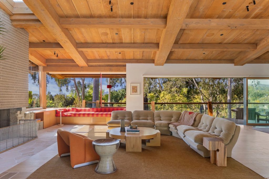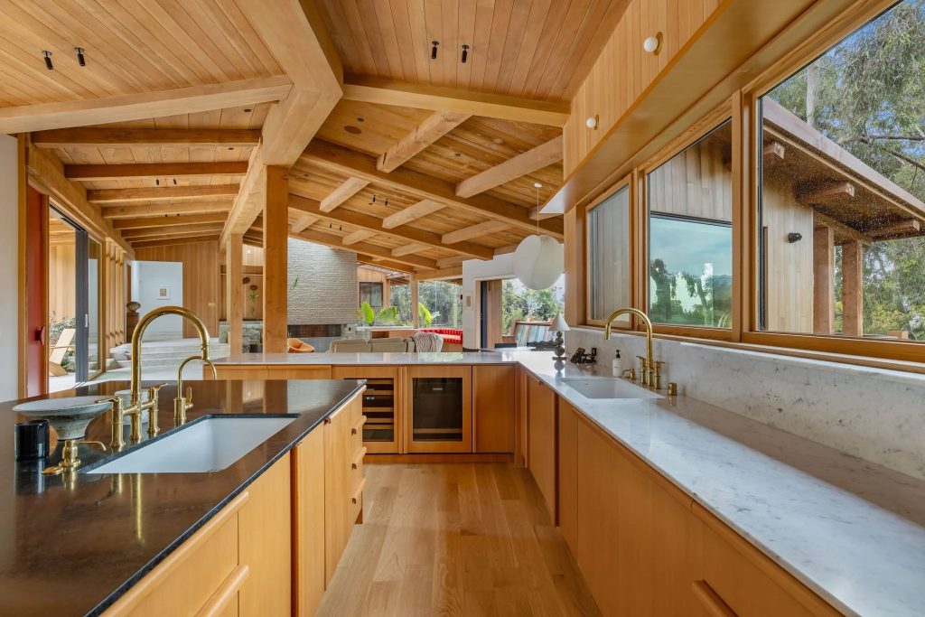 At the centre of the plan is a large great room, where sliding glass walls open directly to terraces, gardens and the pool. An original old-growth timber ceiling and fireplace remain in place, anchoring the space and reinforcing the home’s mid-century lineage. Living, dining and kitchen areas are arranged laterally, each oriented to natural light and views toward the Santa Monica Mountains and the Pacific Ocean beyond. Douglas fir is used extensively throughout, paired with hardwood and stone floors.