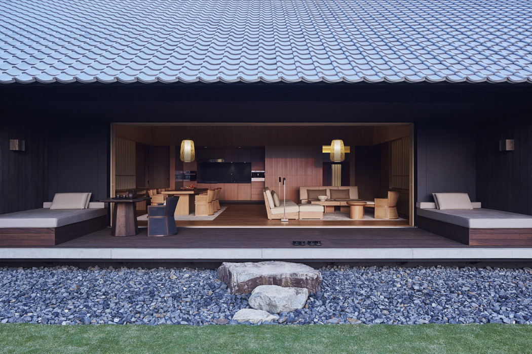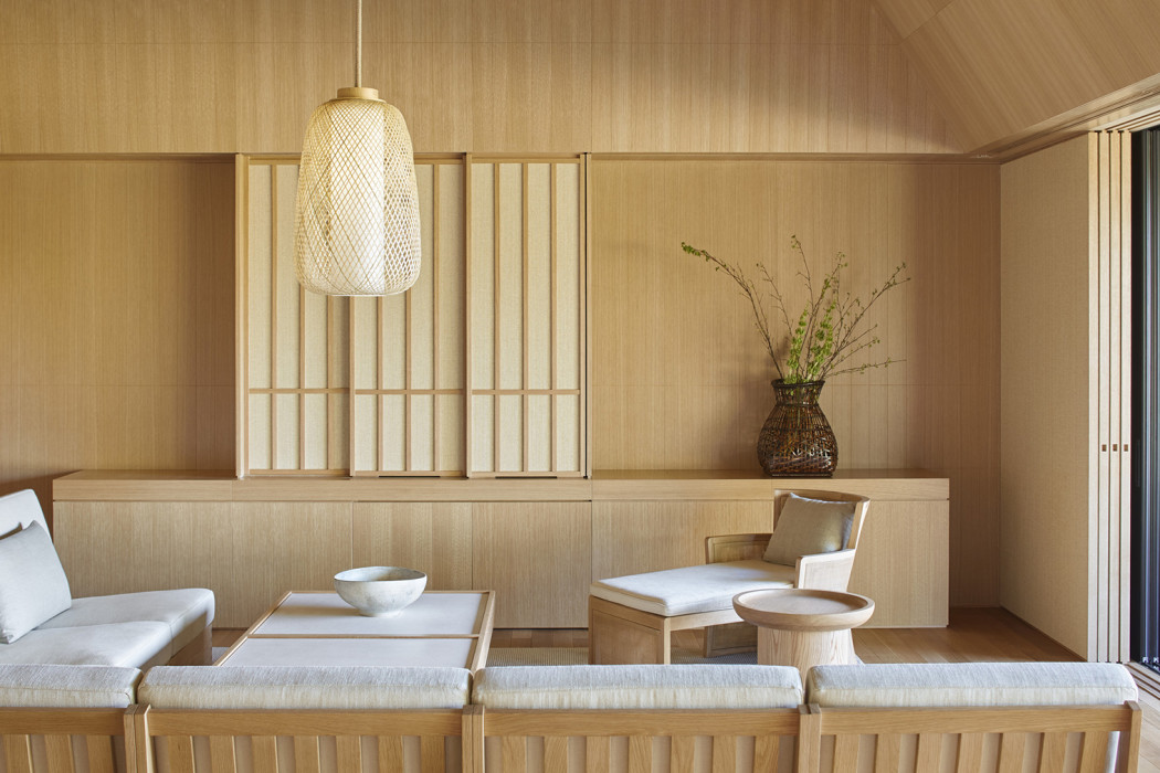 The design of Amenemu draws on Japan’s historical minka homes, featuring low-slung tiled roofs and dark-stained cedar exteriors. Interiors are dotted with woven textiles, timber sliding doors and wooden screens, handcrafted using the Kumiko technique dating back to the 7th century.