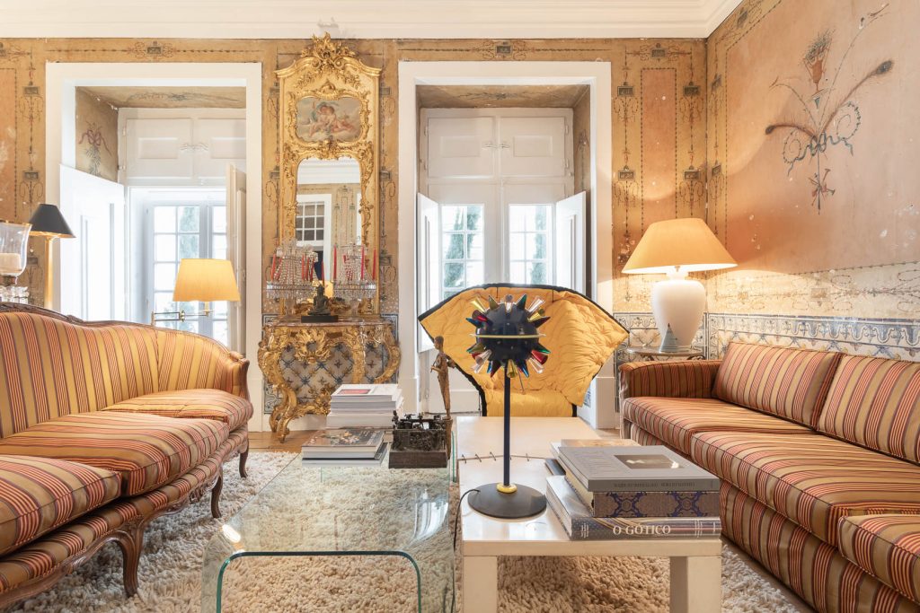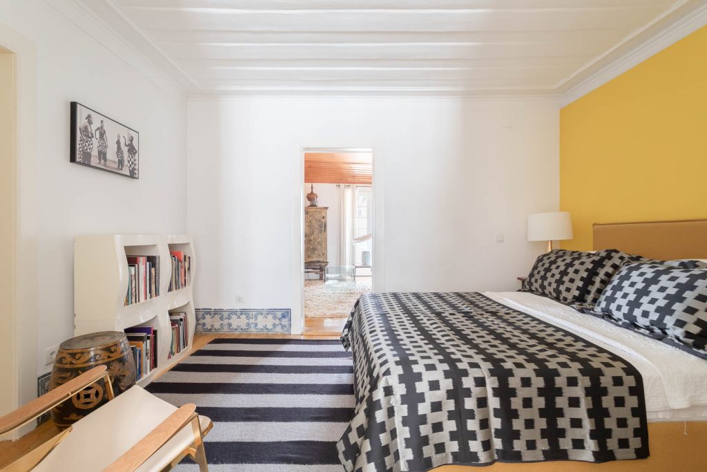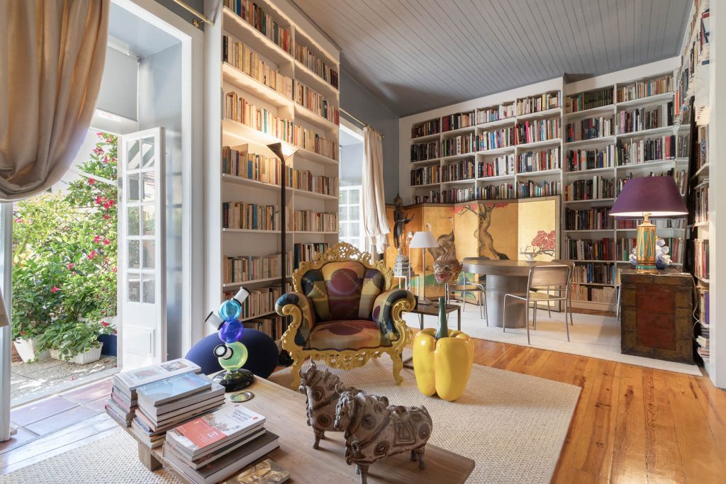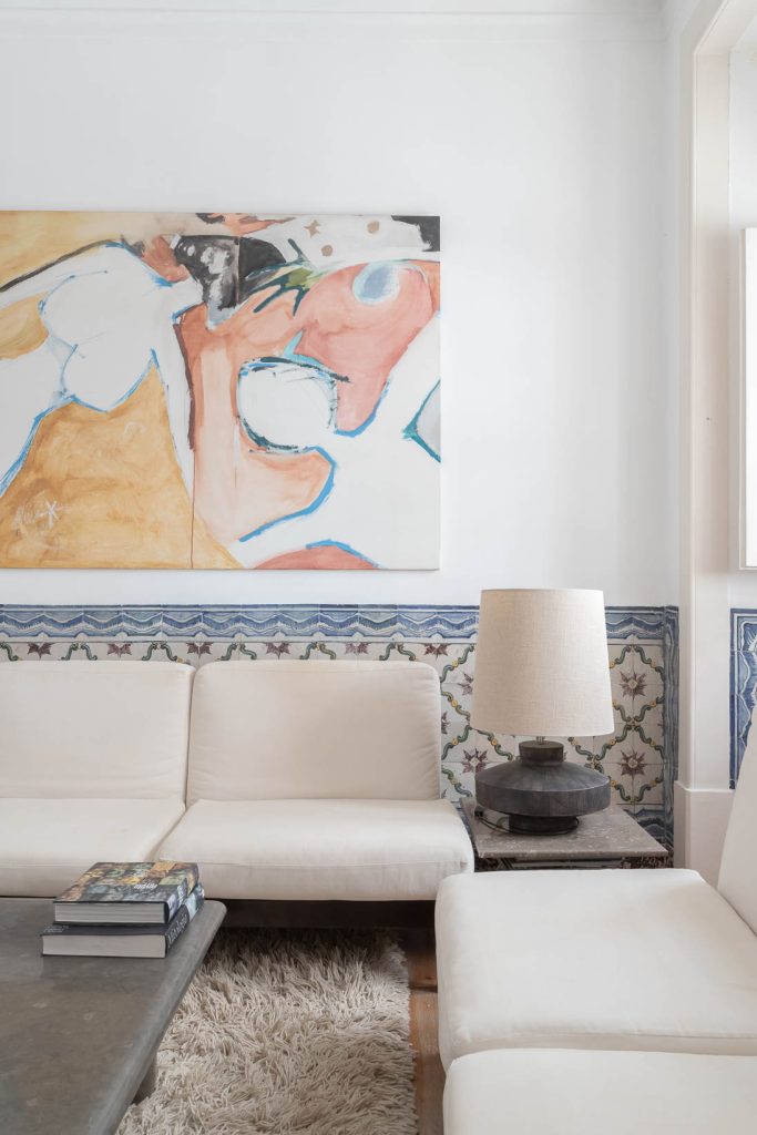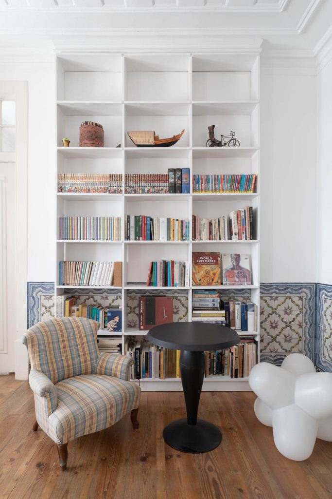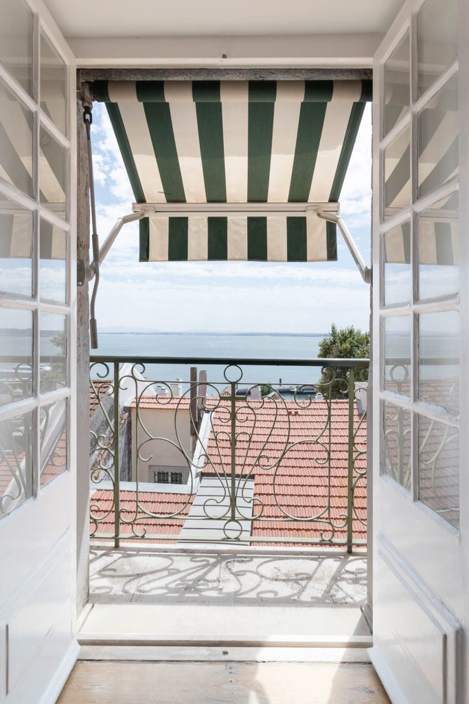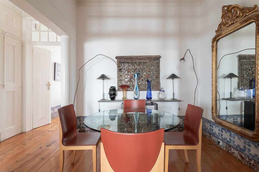 The ground floor pairs a sculptural loft with a heritage space lit from both front and rear, offering scope for conversion into an additional apartment, garage or workspace. Above, six apartments carry traces of the building’s long life: azulejo panels, period mirrors, simple terraces and upper rooms oriented toward the Tagus River. Outdoor space extends to 52sqm across balconies and a small garden.