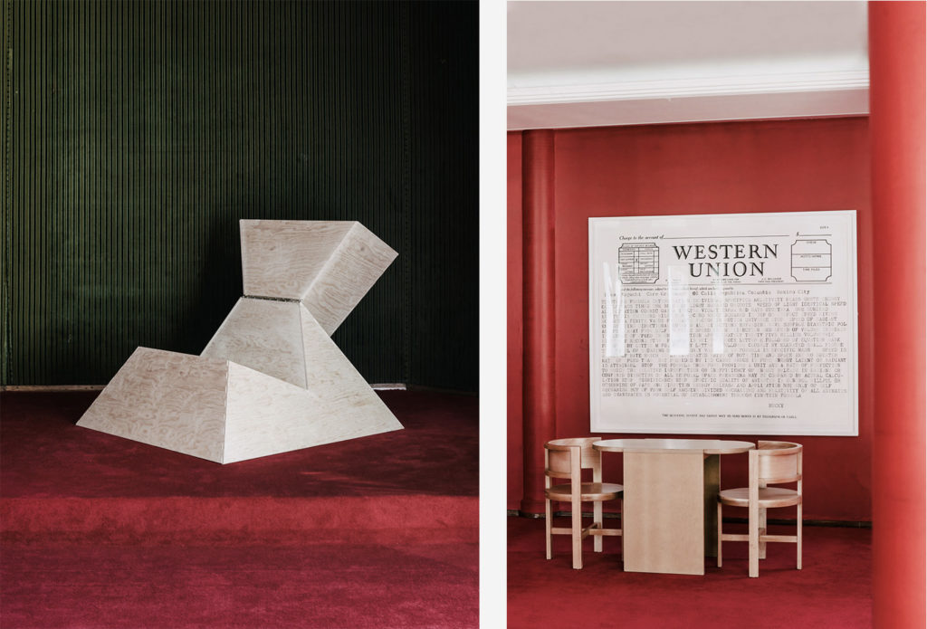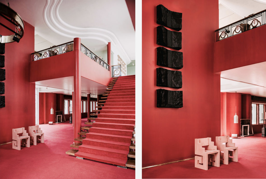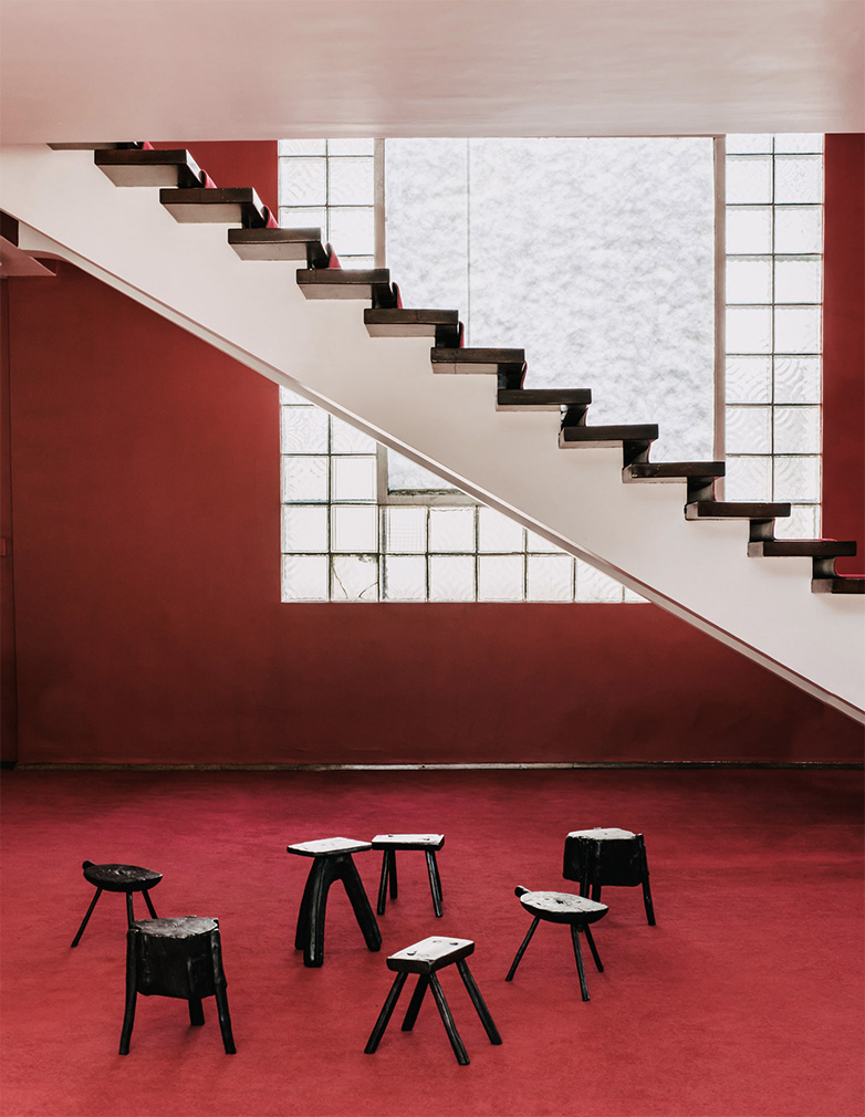 The setting couldn’t be further from the typical white wall gallery show, with soaring ceilings, huge windows, and bright red carpets. Masa has filled the house, which has been empty for 50 years, with pieces by Mexican artists and designers including Frida Escobedo and Pedro Reyes.