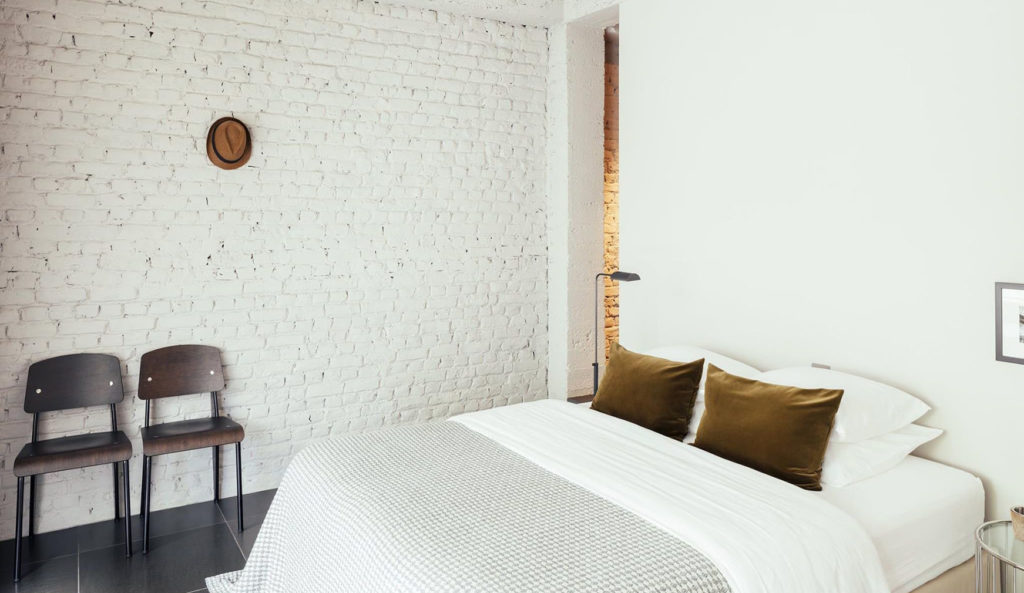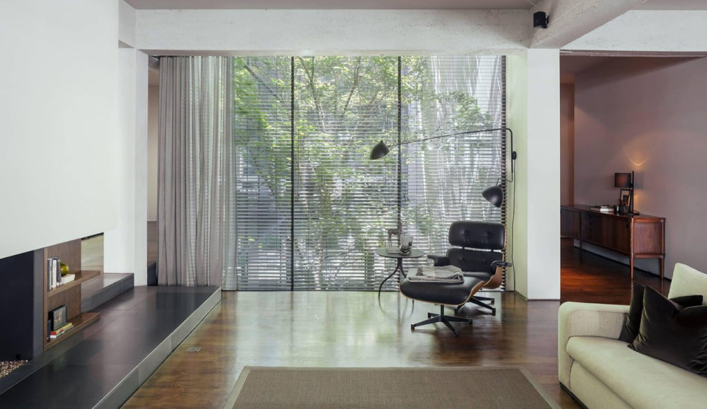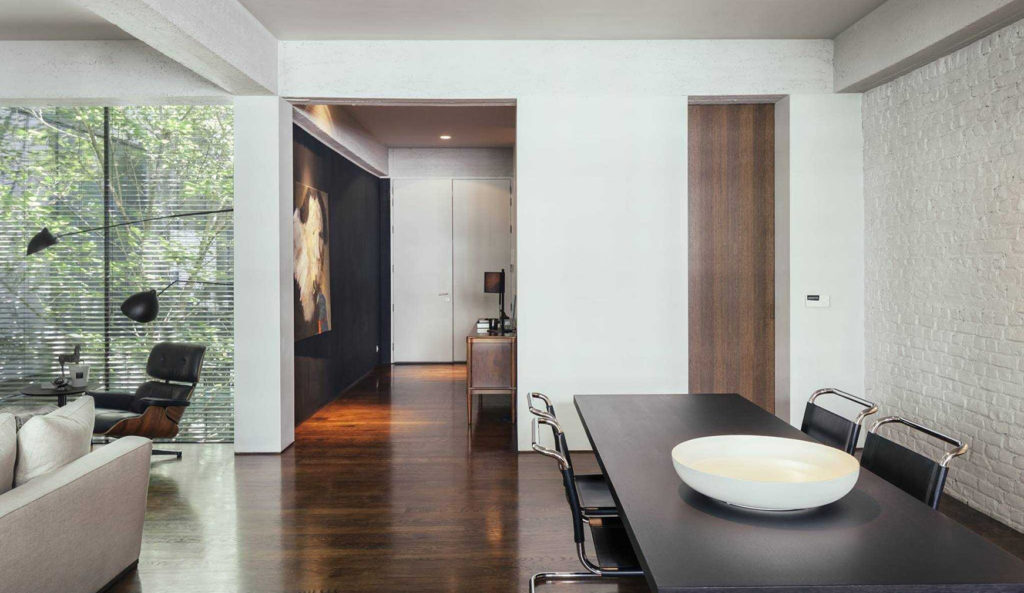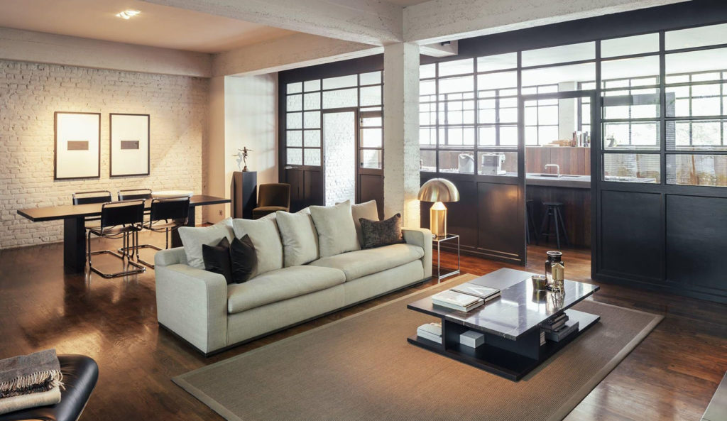 Modernist and art deco touches, as well as original wooden beams, have been integrated to create a soft industrial vibe across the two-bedroom loft. Meanwhile, the old office doors now divide the kitchen and living room.