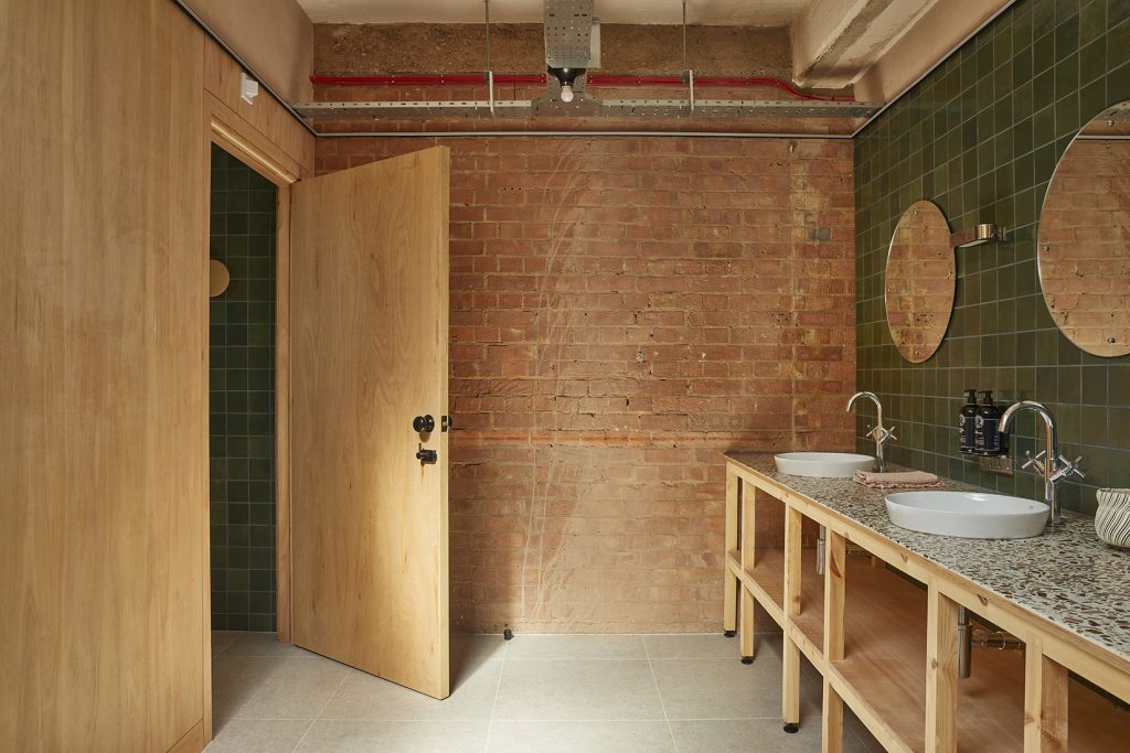 A staircase repainted in Loom’s signature terracotta leads down to the wellness area with tiled changing facilities and a large multipurpose space with sound-absorbing wood panels.