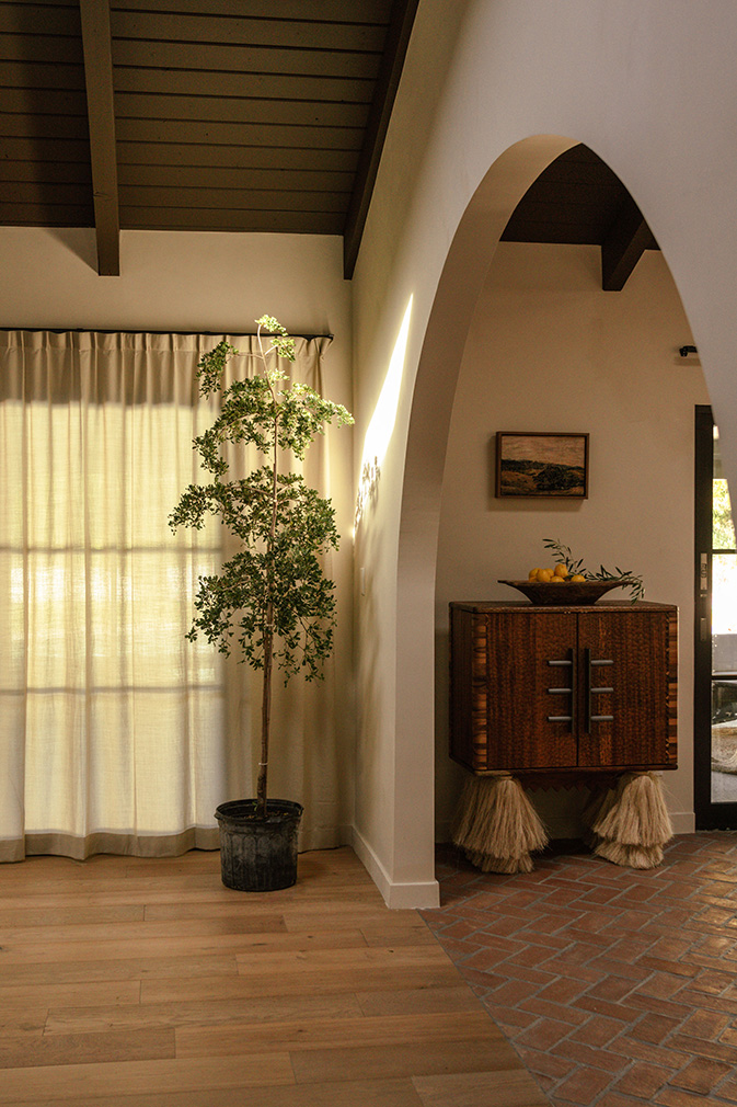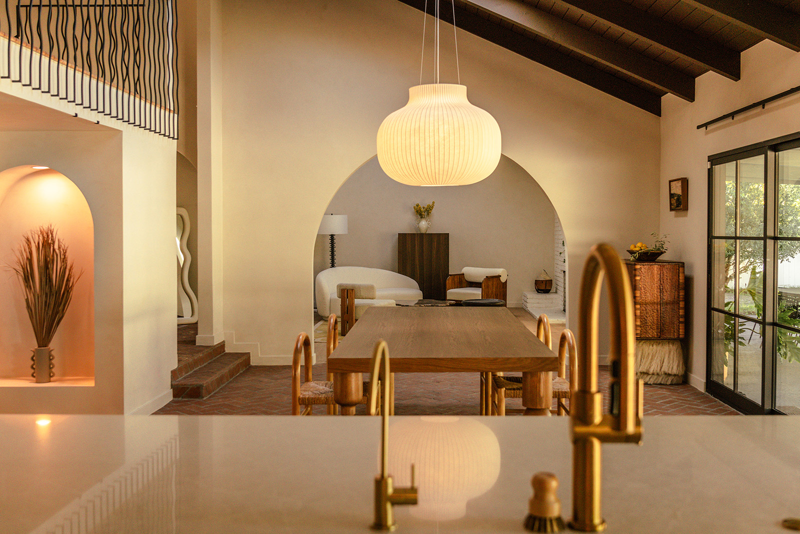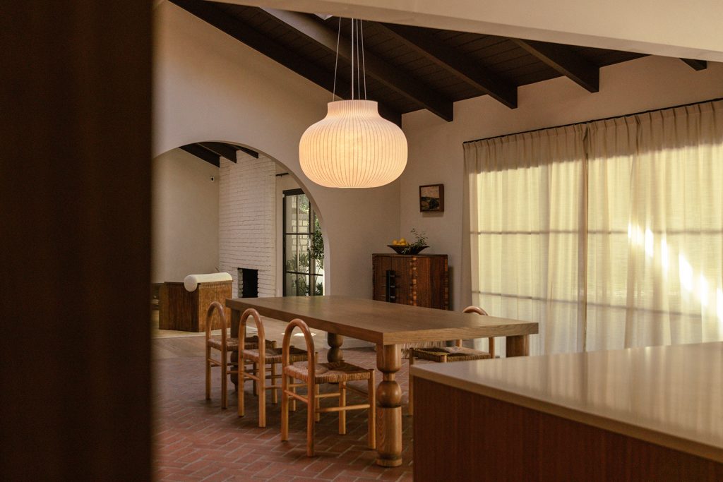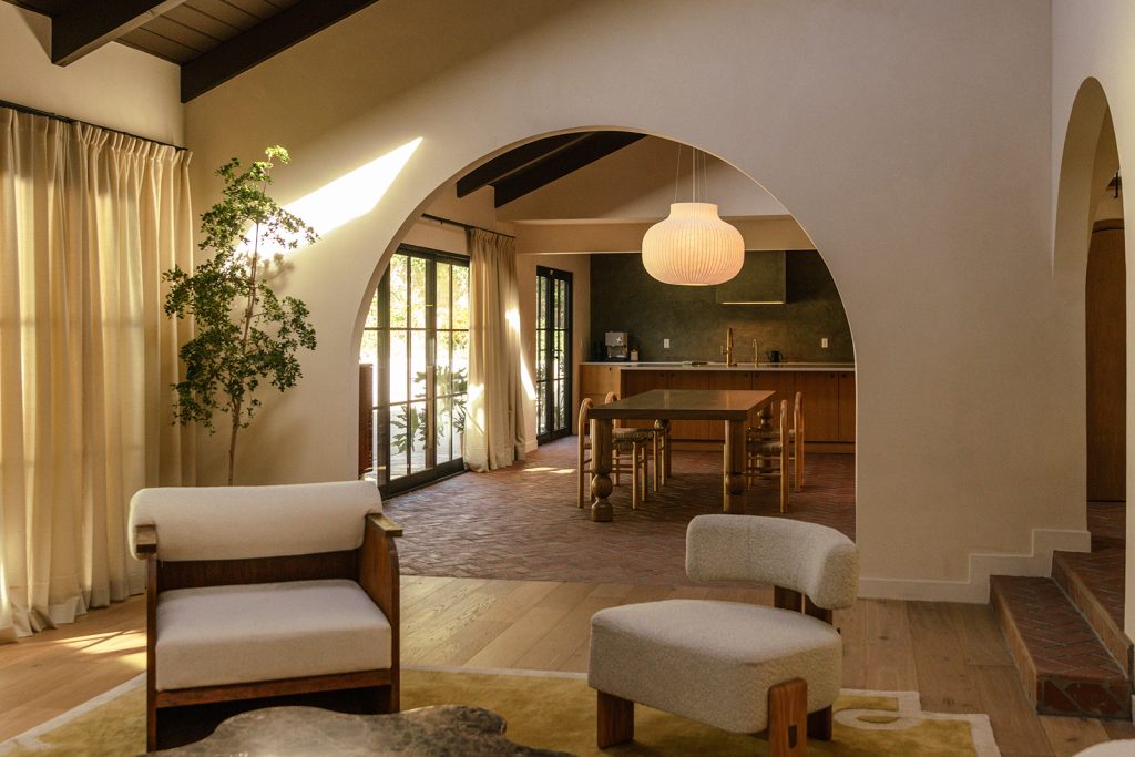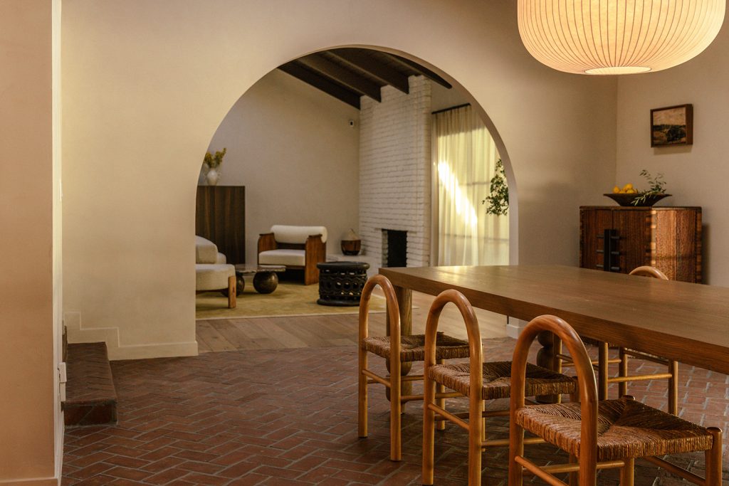 In this So-Cal home, currently listed for $2.2 million, brick flooring sets the tone on entry, carrying movement beneath a sequence of arches that emphasise the vaulted ceilings. The 1962 architecture relies on a new design by Working Holiday Studio that uses proportion and repetition to define how the spaces unfold.