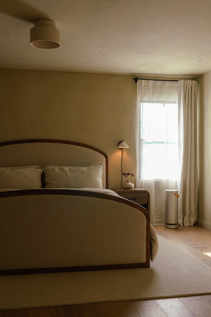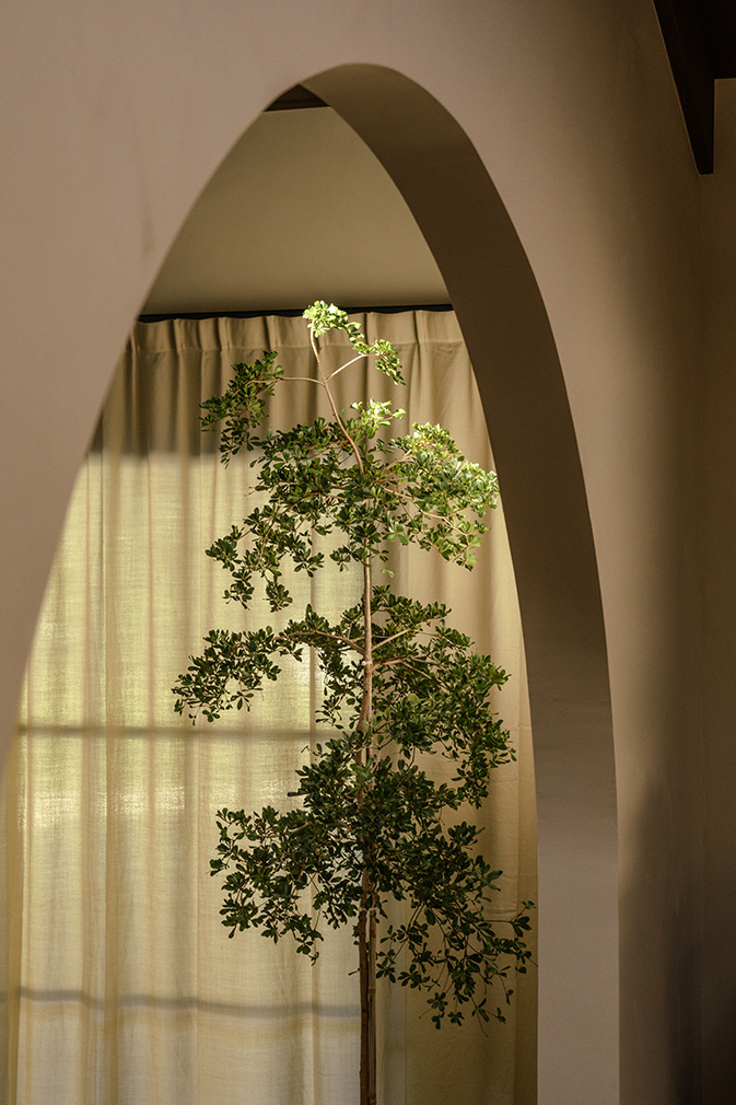 The 2,727sqft interior spans four bedrooms and three bathrooms, with living, kitchen and dining spaces gathered beneath a double-height volume. A mezzanine edge traces the upper level, maintaining visual connection without enclosing the plan. As brick flooring gives way to timber in the adjoining rooms, the palette is kept restrained and consistent — the continued appearance of arched thresholds reinforces that continuity. Throughout the day, light moves easily through the house, softening the materials and maintaining a clear relationship between rooms.