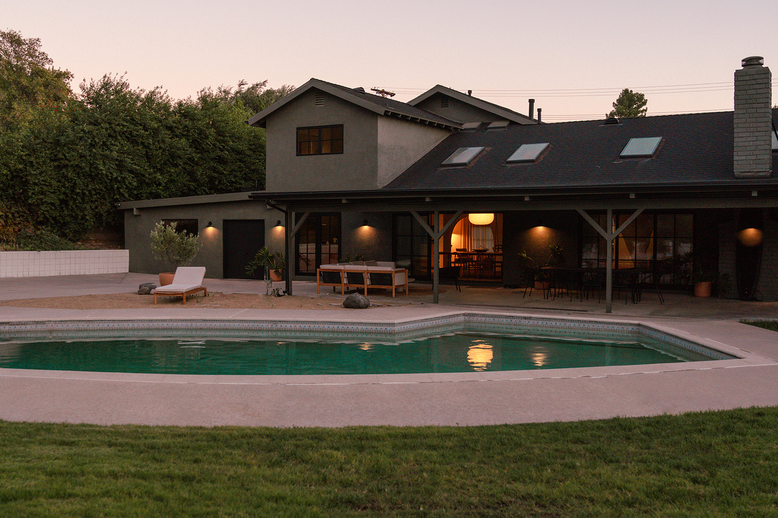 The careful renovation works with the logic of the original structure rather than against it. And outside, mature planting extends the living spaces beyond the interior with views over the adjacent golf course to the Granada Hills.