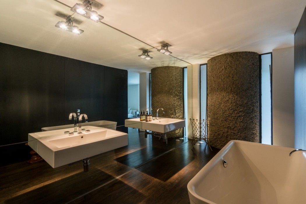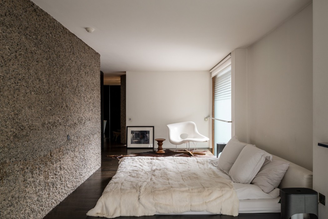 Four of the bedrooms encircle the central living area while the mezzanine level contains the master bedroom. Mackay and Wiles added prefabricated joinery by Molteni & C as well as a kitchen from Dada, and the fittings only lightly touch the walls and pillars, if at all.