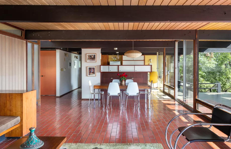 The post-war Californian property is situated at the end of a cul-de-sac in Eagle Rock and is unaltered after six decades. A red brick exterior gives way to light interiors with clerestory and louvred windows, brick floors, bespoke walnut cabinetry and exposed beams.